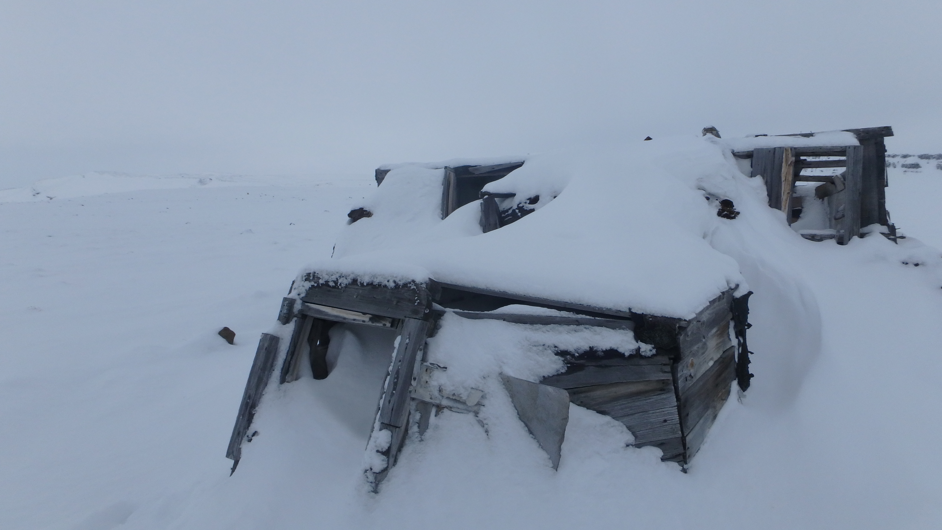 A turf house made of peat and wood still stands in Dundas Village, at one time used to house up to 20 hunters through harsh Arctic conditions. Dundas Village, Thule, Greenland.