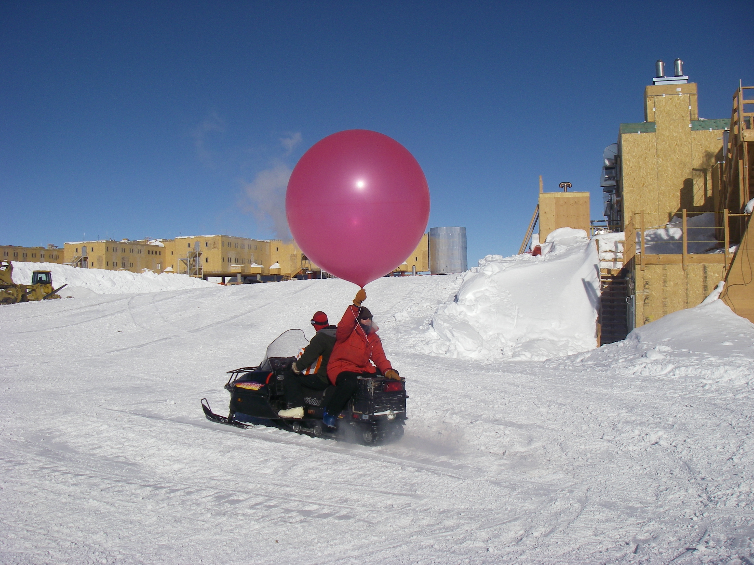 NOAA team member Andy Clarke and Patrick Cullins on a snowmobile, driving the pink surface ozone balloon to launch outside the station. In front of the NOAA Balloon Inflation Facility at the Amundsen-Scott South Pole Station, Antarctica.