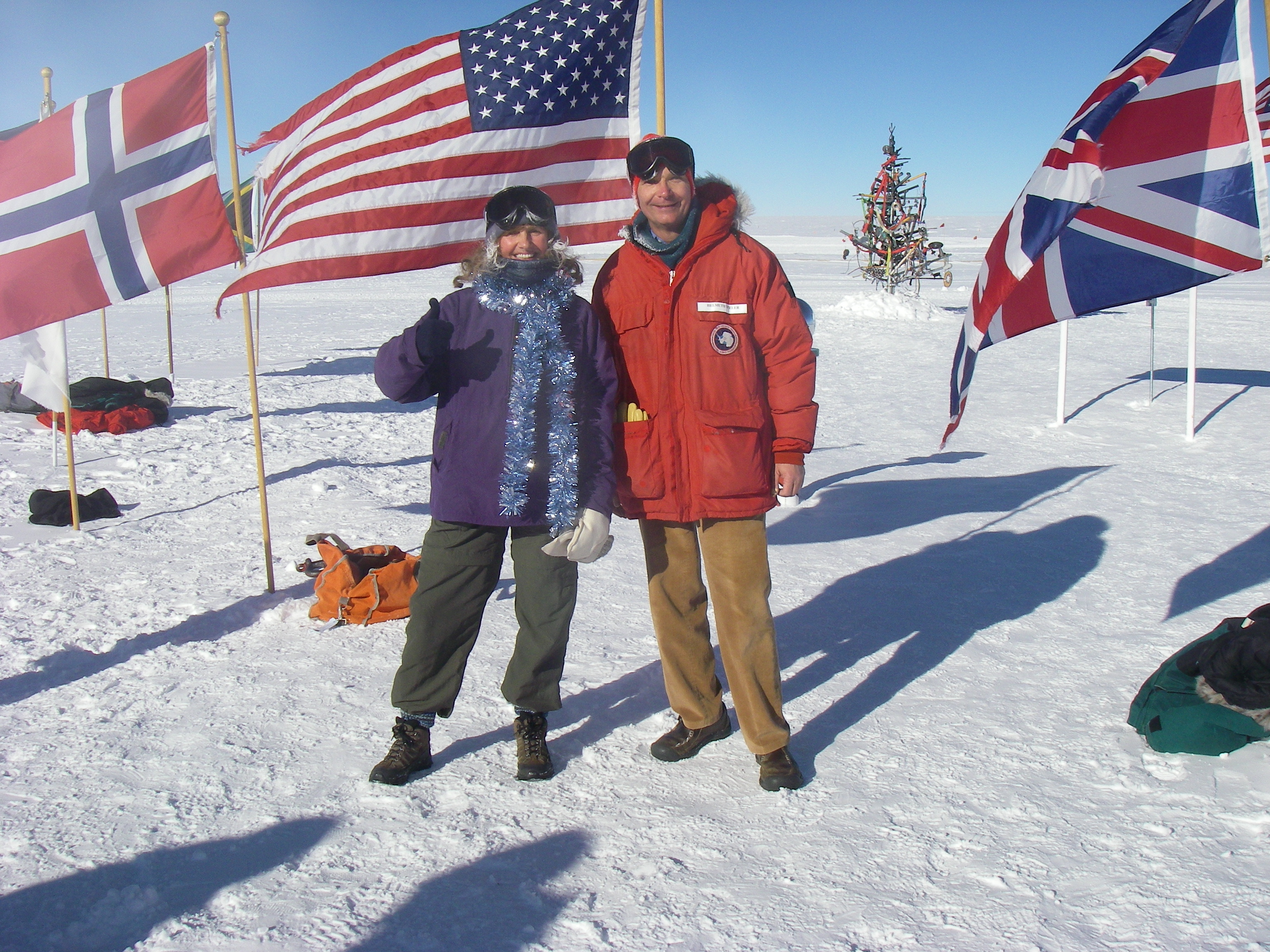 Elke Bergholz and astrophysicist Helmuth Spieler at the Ceremonial Pole after the "Race Around the World", which is held every Christmas morning at the South Pole Station. Members run, drive, walk, or ski round the pole three times, a total of about 2.5 miles. Special prizes for the winners and a t-shirt for all who complete the race are waiting at the finish line. Many people attended and completed the race, even at such a high elevation and minus 40 F with windchill factor. At the Geographic and Ceremonial Pole of the Amundsen-Scott South Pole Station.