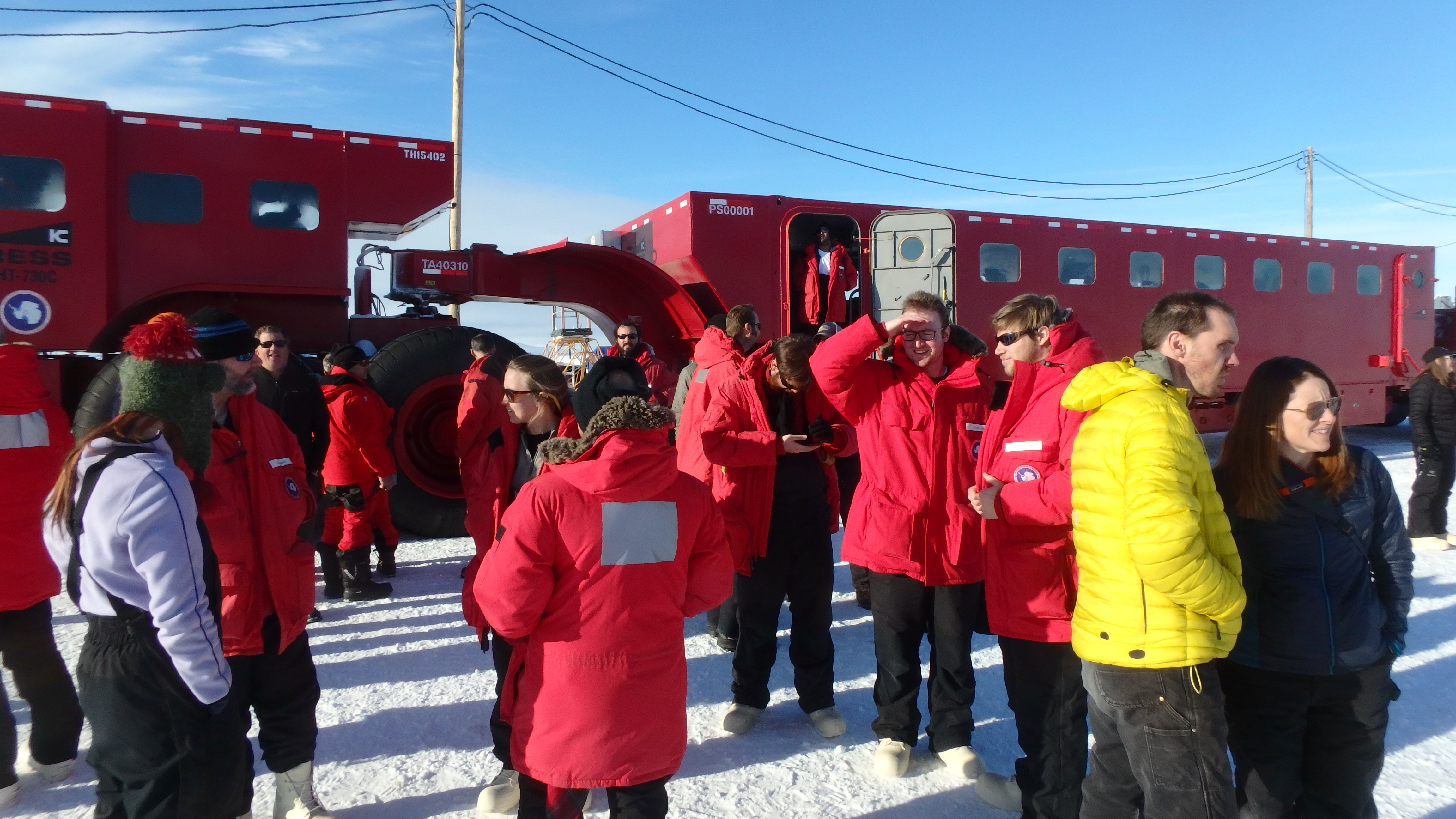 Passengers at the end of their summer field seasons wait to board a C-17 at the new Phoenix Airfield, on the Ross Ice Shelf, Antarctica.