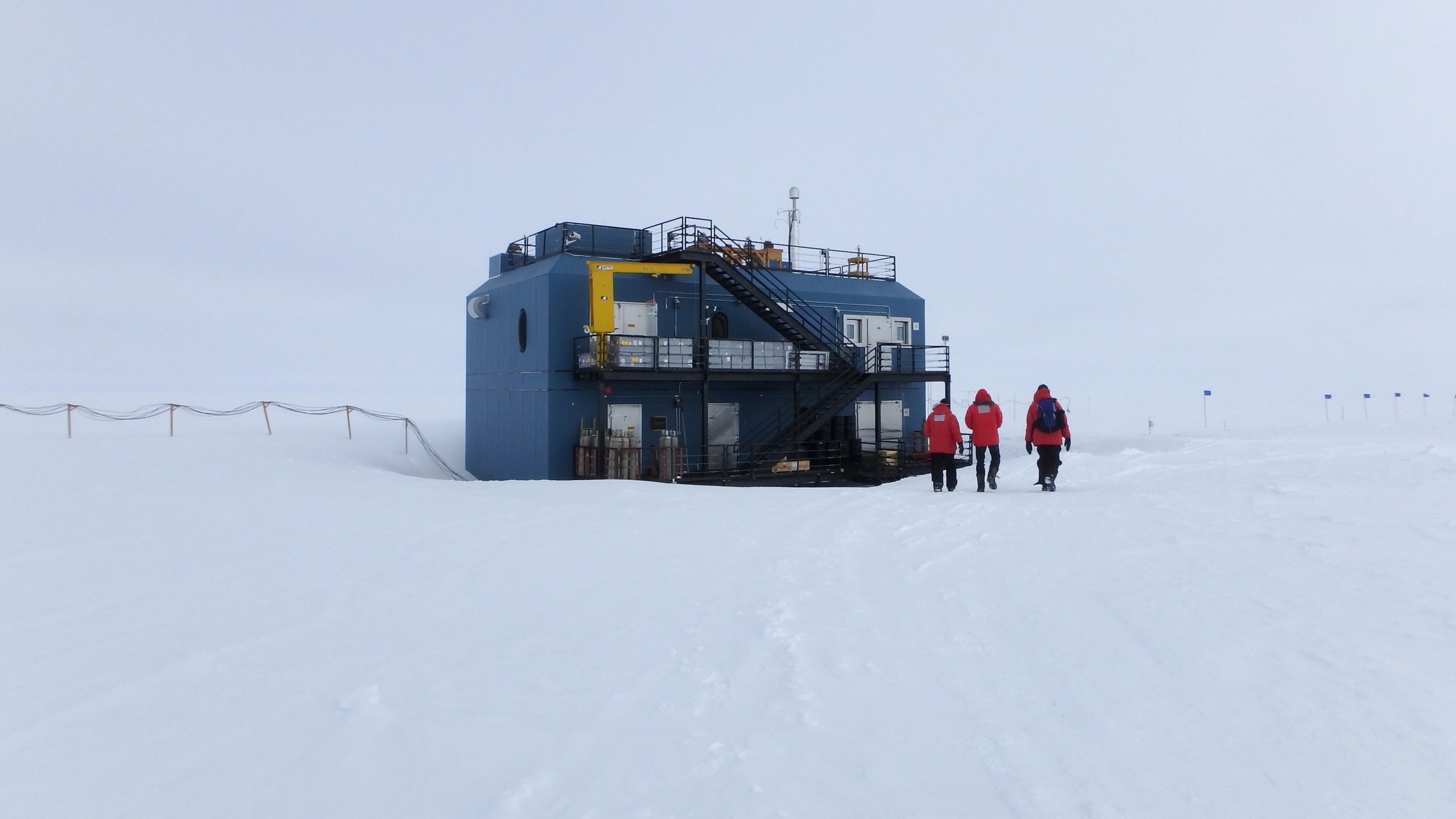 Walking to the Atmospheric Research Observatory in the clean air sector. This area is upwind of the station's pollution and thus has some of the cleanest air in the world. Amundsen-Scott South Pole Station, Antarctica.