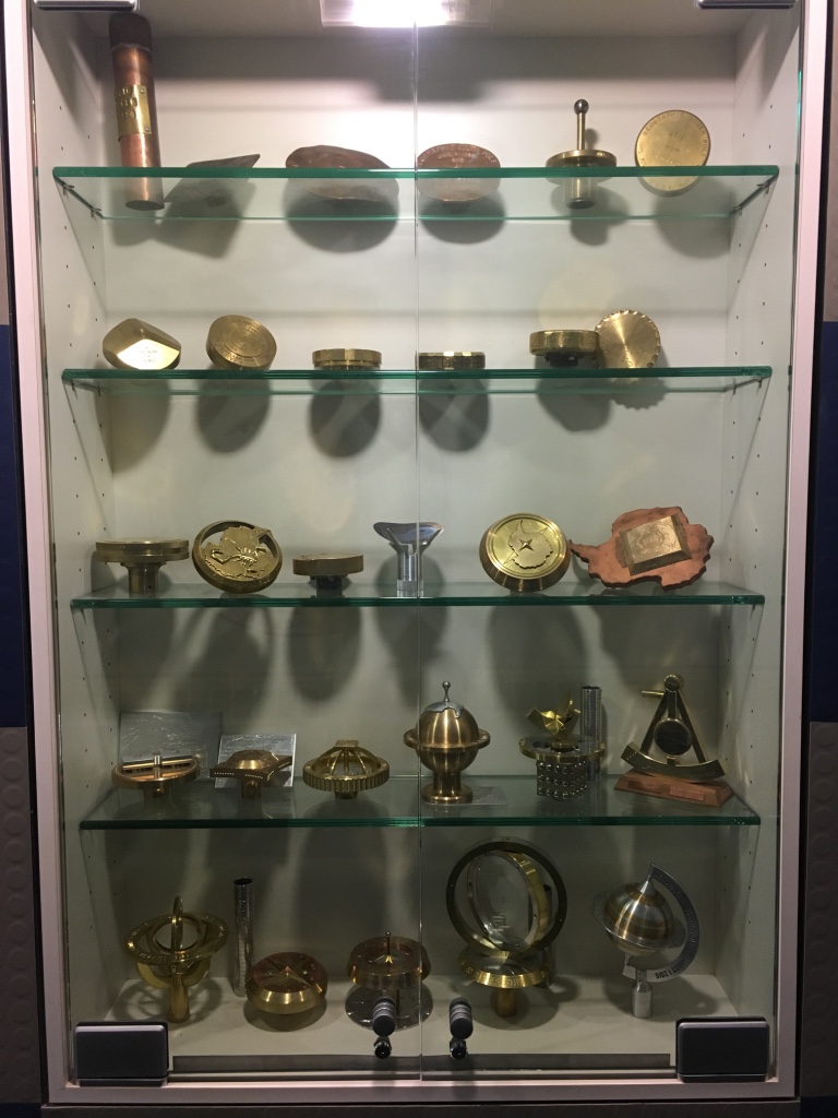 The past markers of the Geographic South Pole are on display in the station. Each year's marker is a unique design created by the winter-overs. Amundsen-Scott South Pole Station, Antarctica.