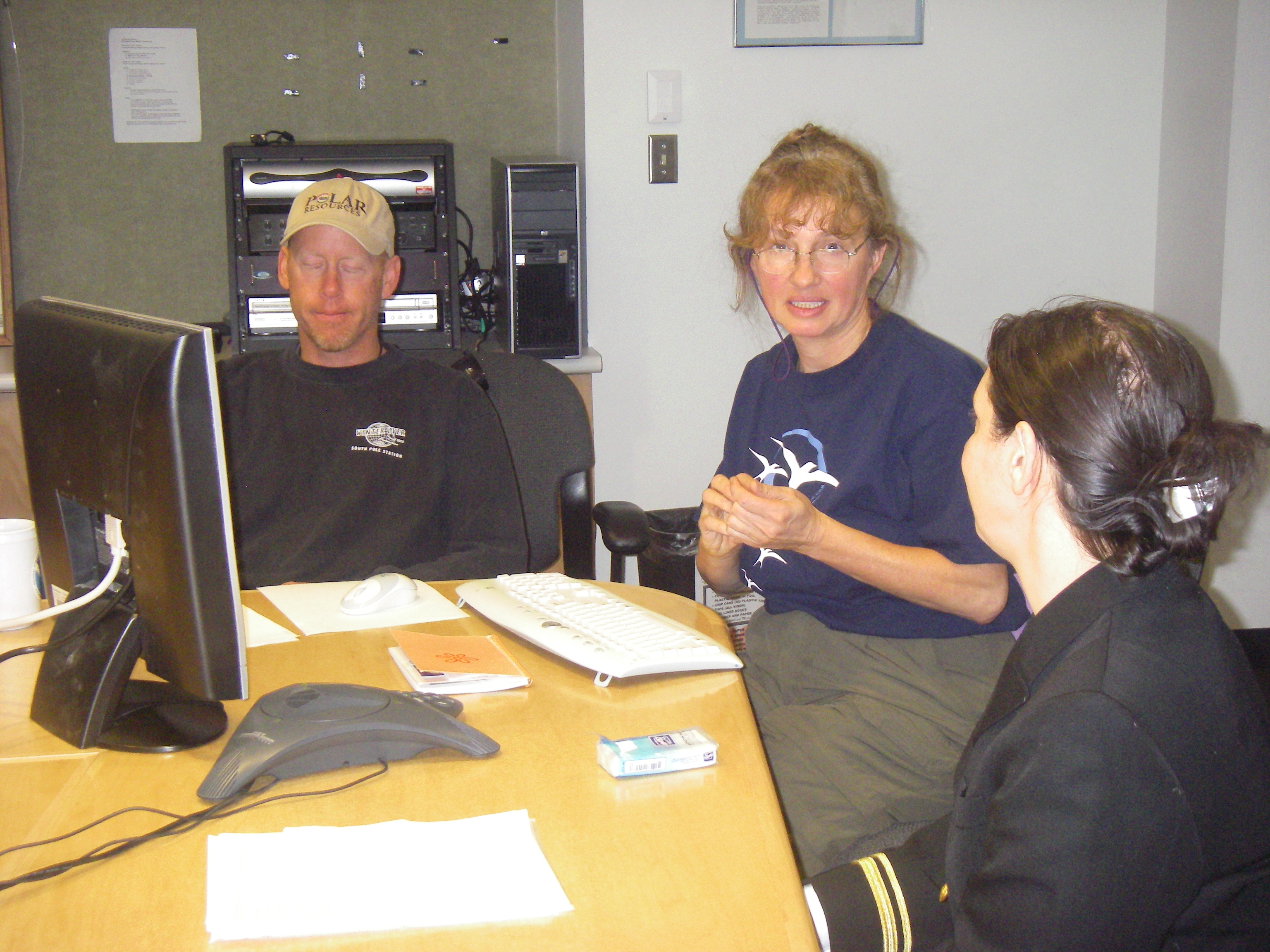 Andy Clarke, Elke Bergholz, and Amy Cox (from left to right) are preparing for the "Live from IPY" webinar. In the conference room inside the new elevated Amundsen-Scott South Pole Station, Antarctica.