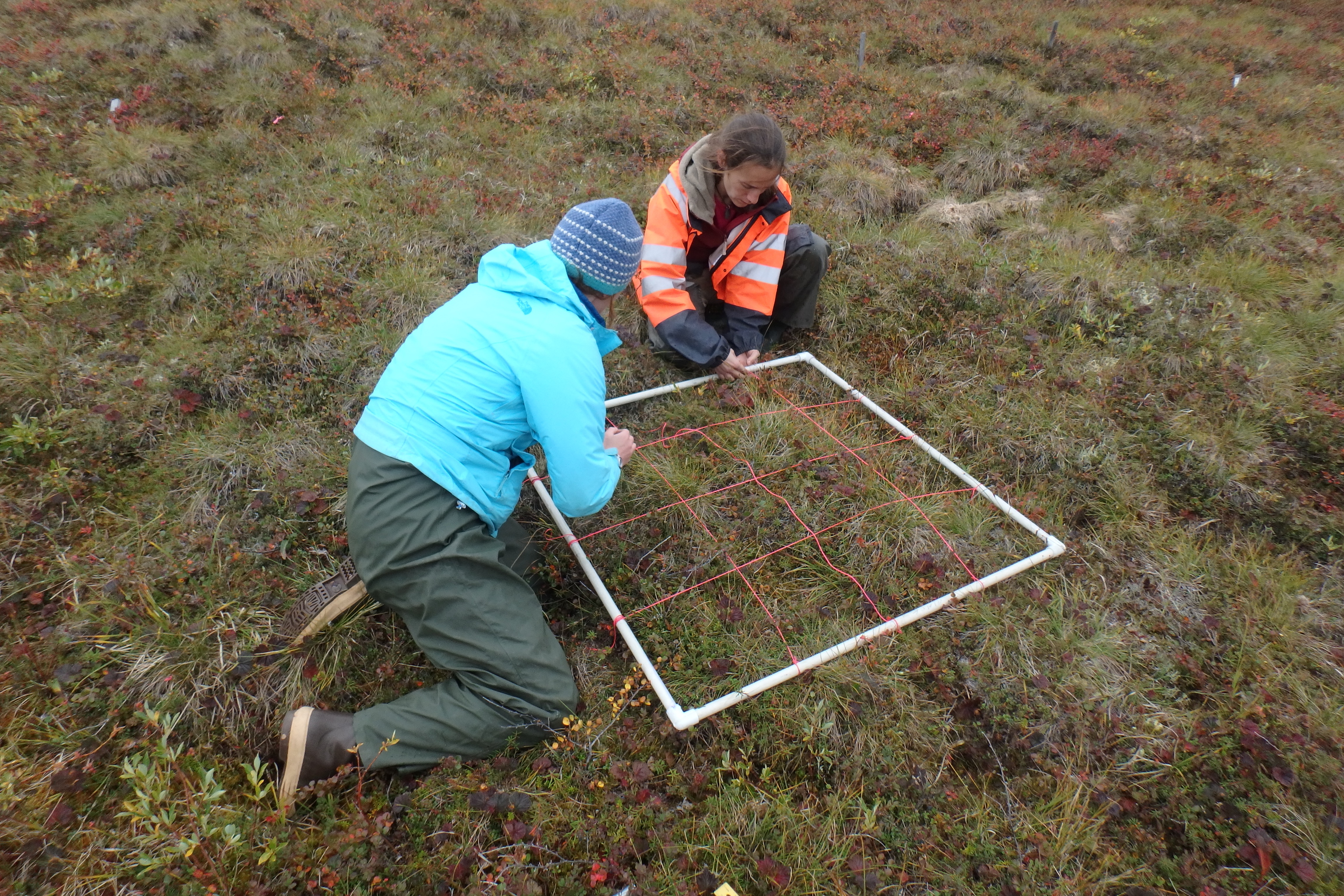 Rebecca Hewitt and Helene Genet lay down a quadrat on a control plot. Toolik Field Station, Alaska.