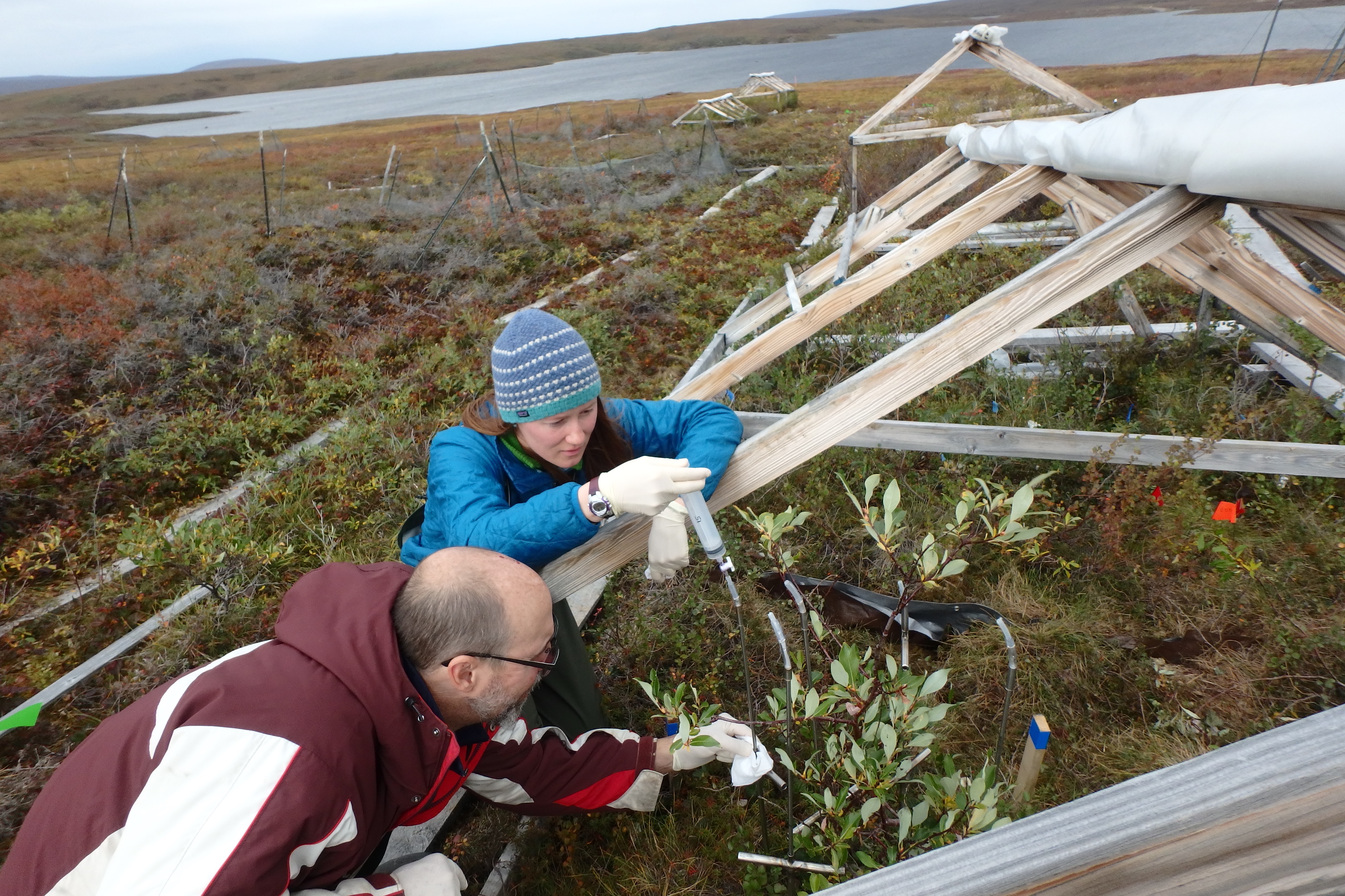 Dr. Hewitt injects ammonium chloride into one of the tubes. Dr. Taylor steadies the tube as sometimes the soil is waterlogged and the isotope can bubble back up into the tube. Toolik Field Station, Alaska.