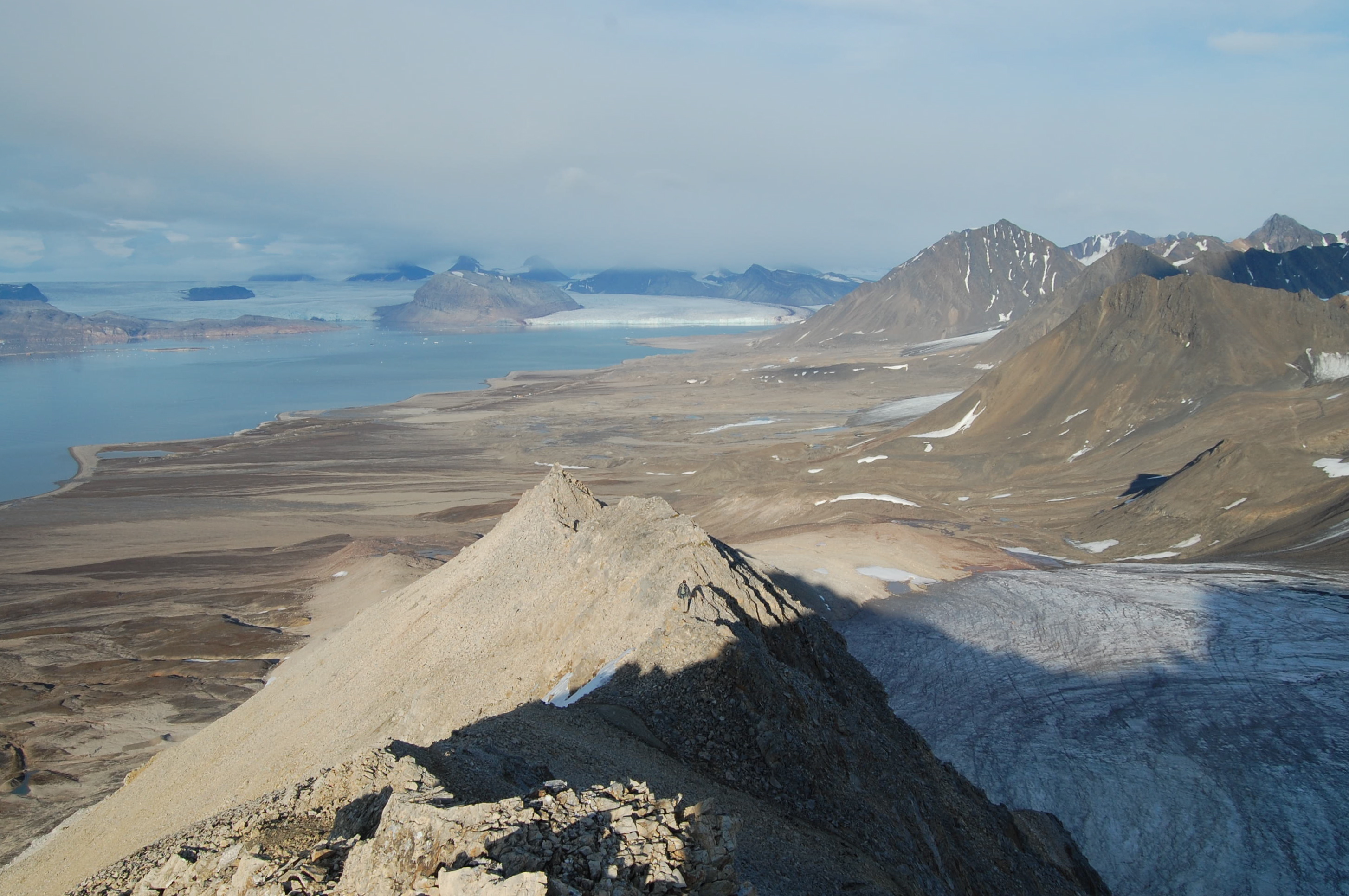 Looking down the ridge on Zeppelin Mountain. In the background is Kronebreen Glacier where the team spends their days studying the sediment. Mark Goldner can be seen along the ridge. Ny Ålesund, Svalbard, Norway.