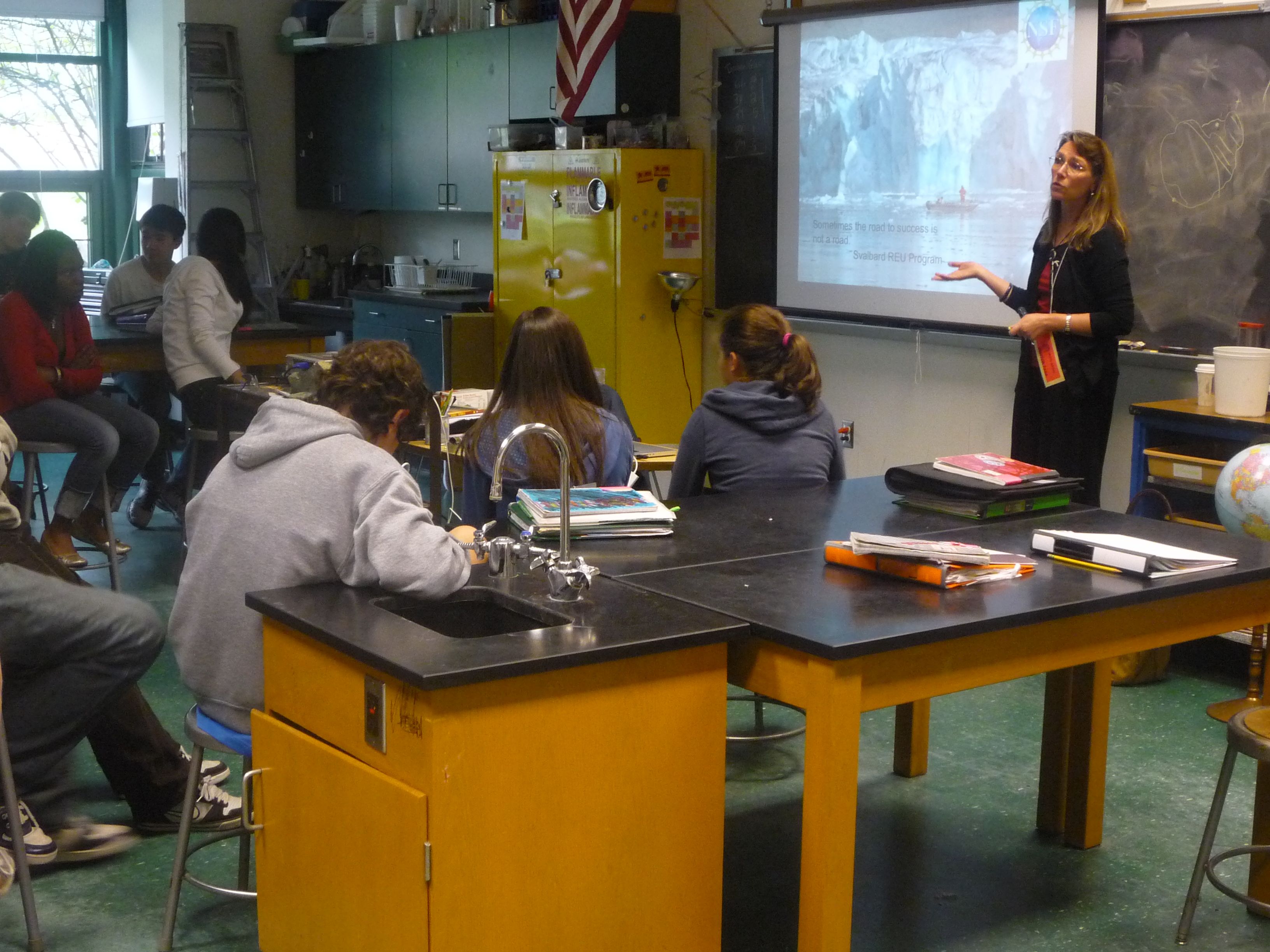 Julie Brigham-Grette explains the dynamics of glaciers to Mark Goldner's class. Brookline, Massachusetts.