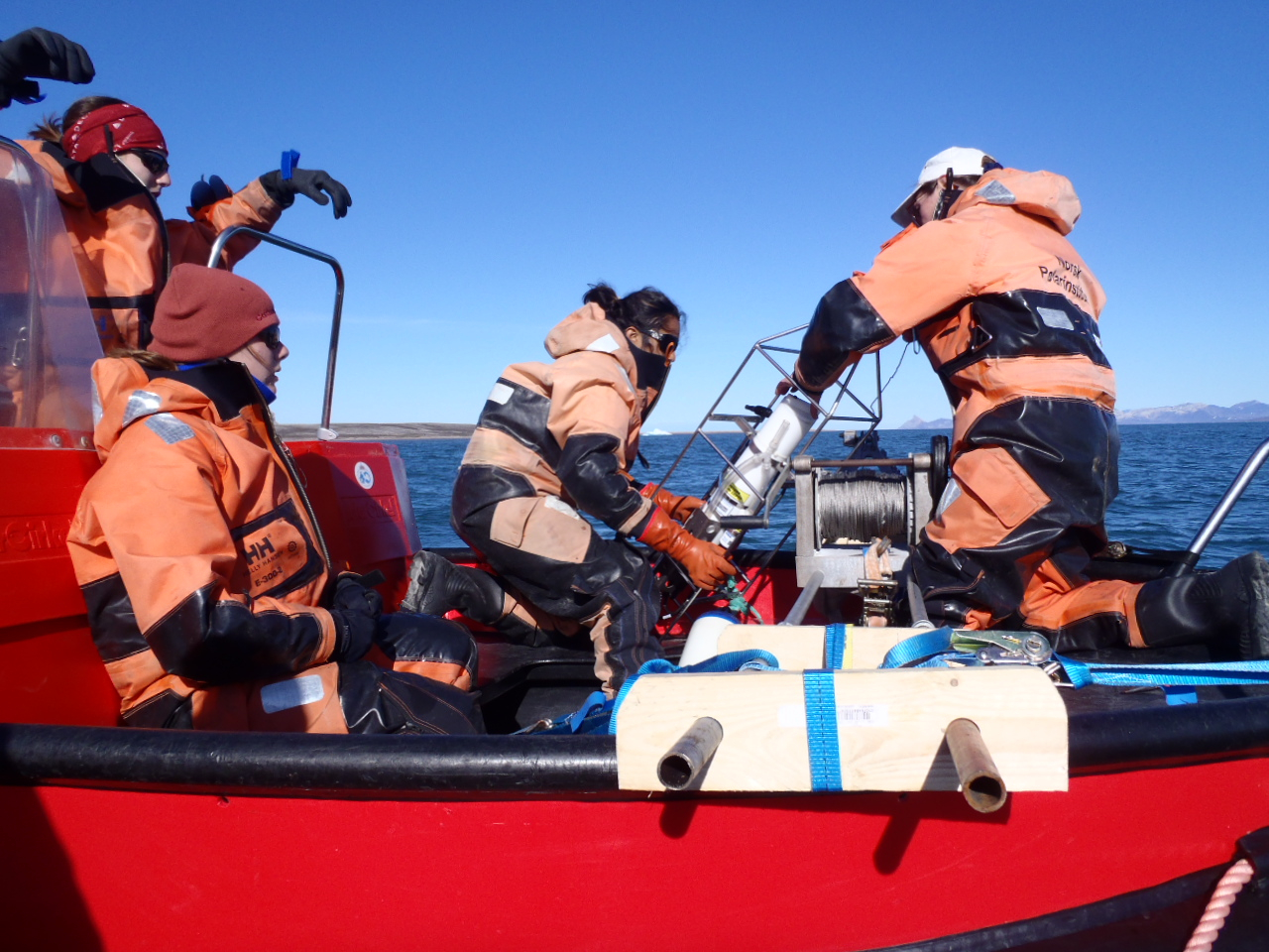 The team tests out the CTD (Conductivity, Temperature, and Depth) instrument. Ny Ă…lesund, Svalbard, Norway.