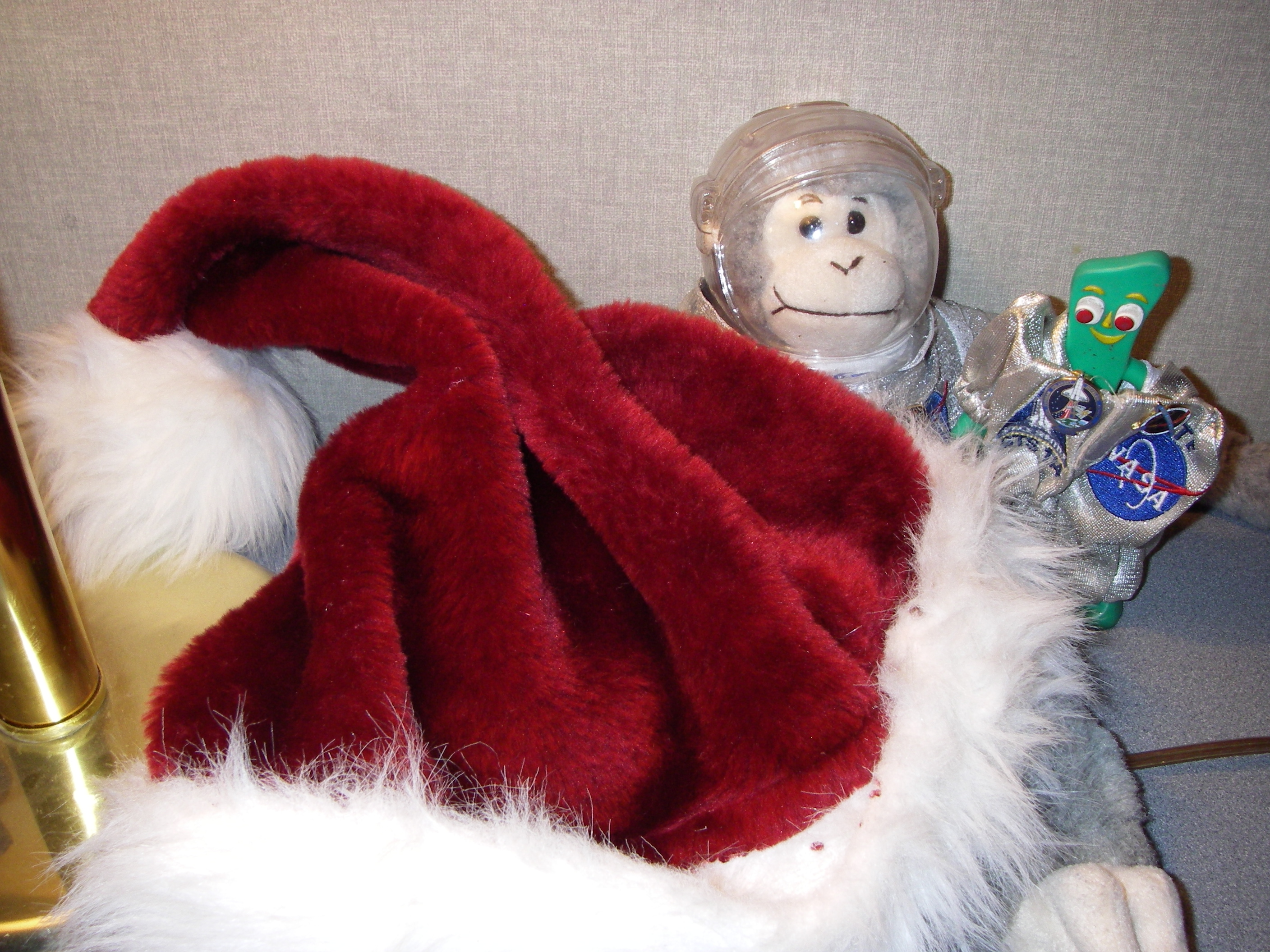 Gumby and Ms. Baker with a Santa hat. Happy Holidays! McMurdo Station, Antarctica.