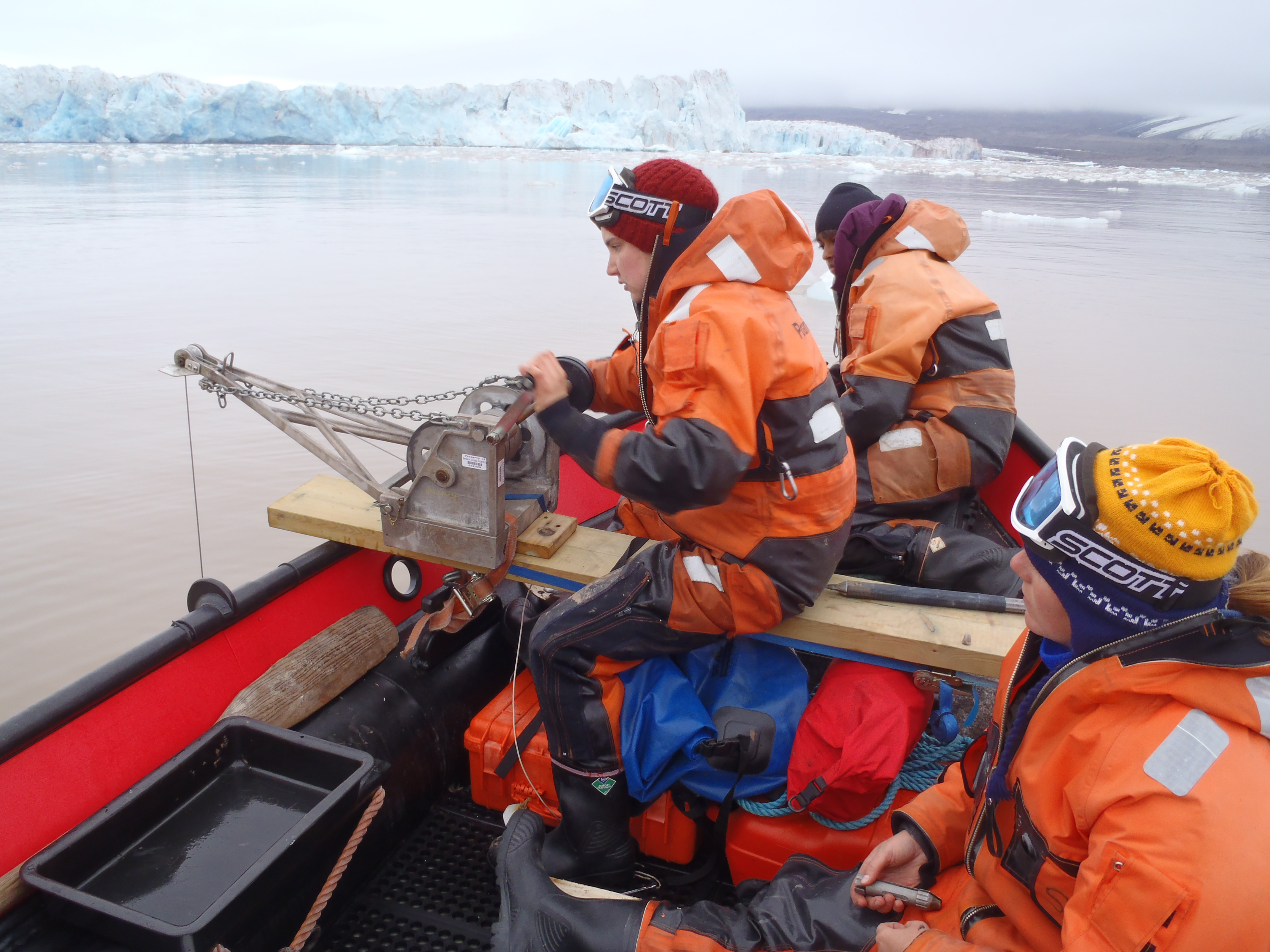 Rebecca Siegel lowers the winch so Liz Ceperley can collect her sediment samples. Meanwhile Mark Goldner keeps the boat in a stationary position. Ny Ă…lesund, Svalbard, Norway.