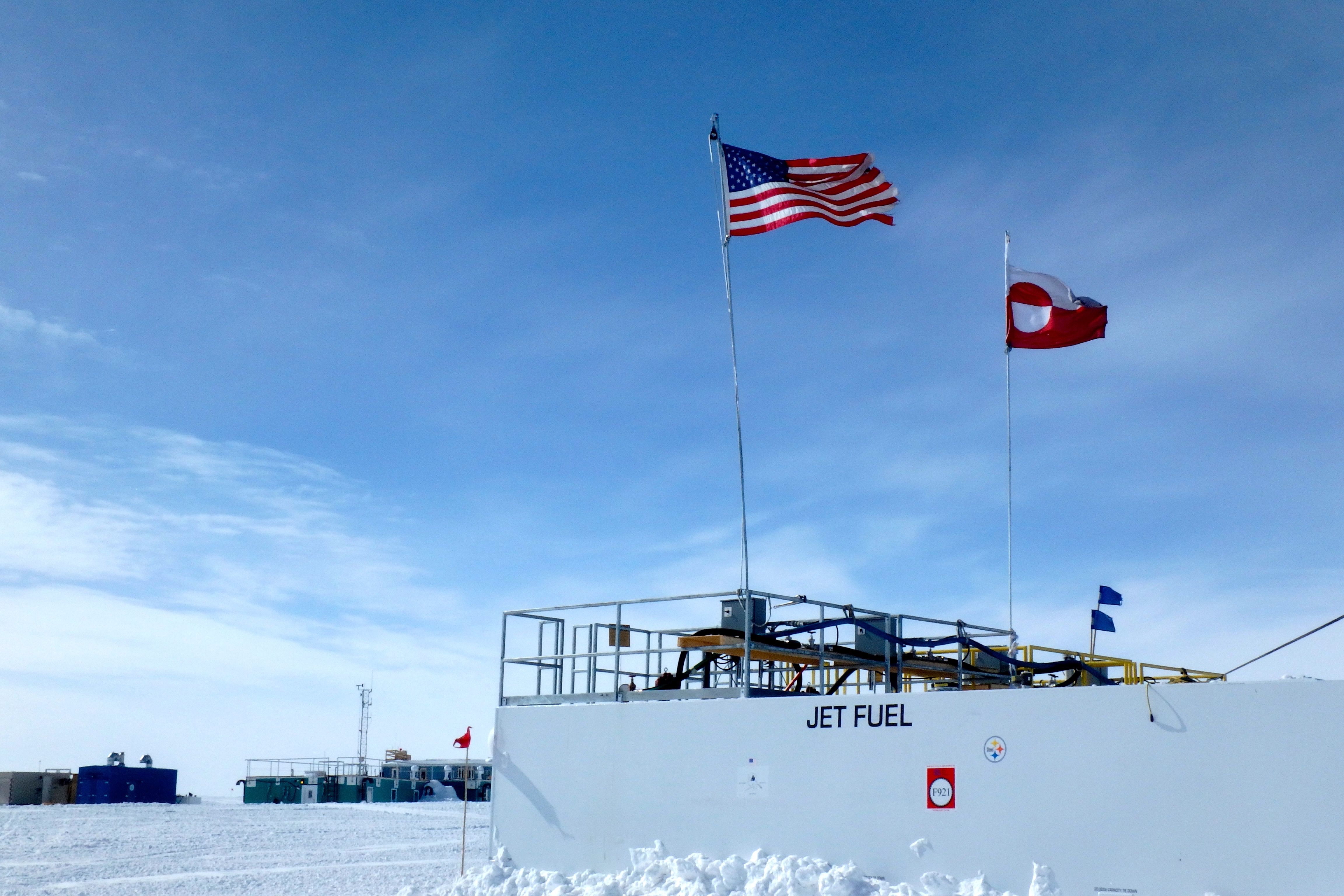 The United States and Greenland flags fly over Summit Station, Greenland.
