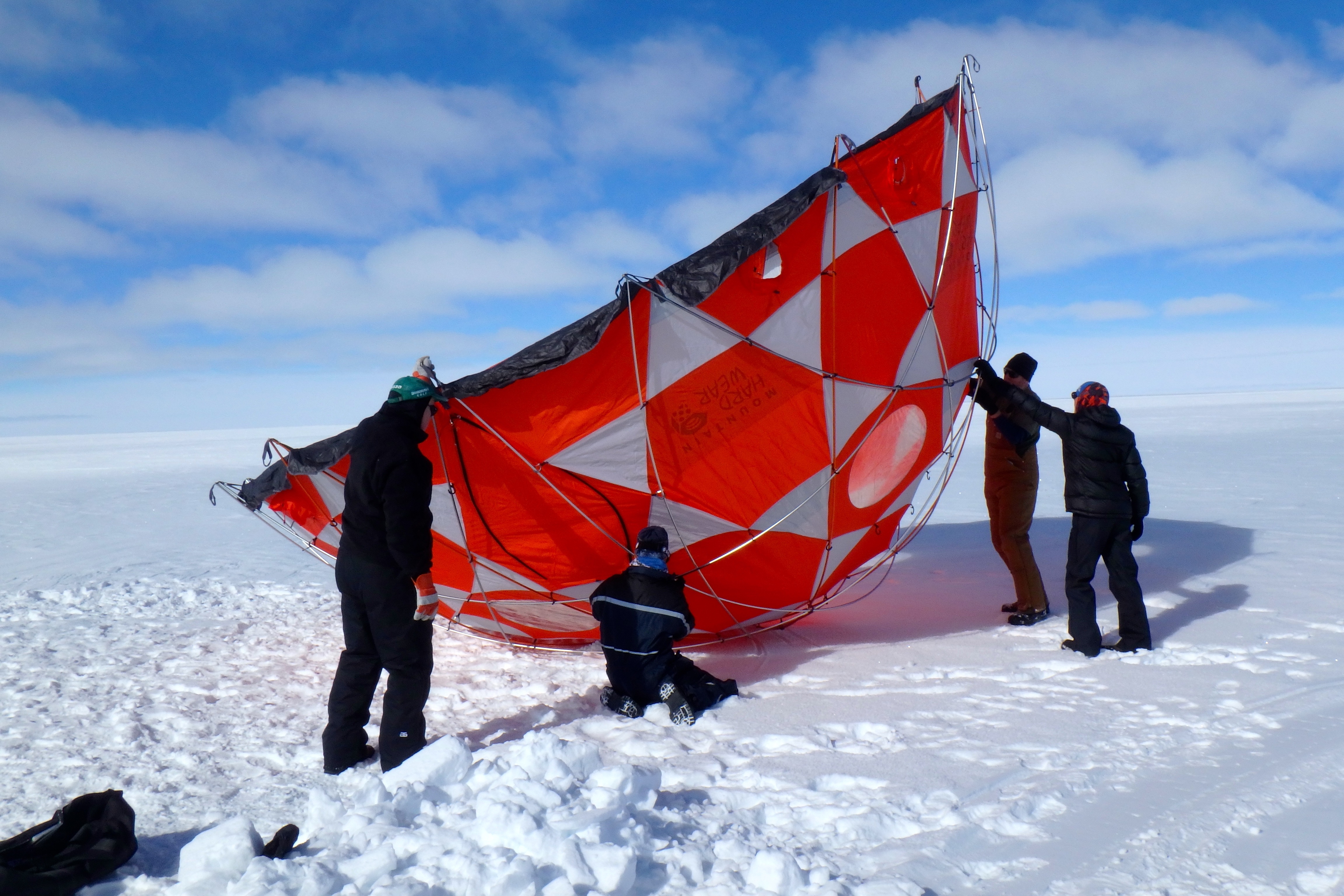 The team works together to set up a large dome tent that will house the drill and protect it from bad weather. Near Summit Station, Greenland.