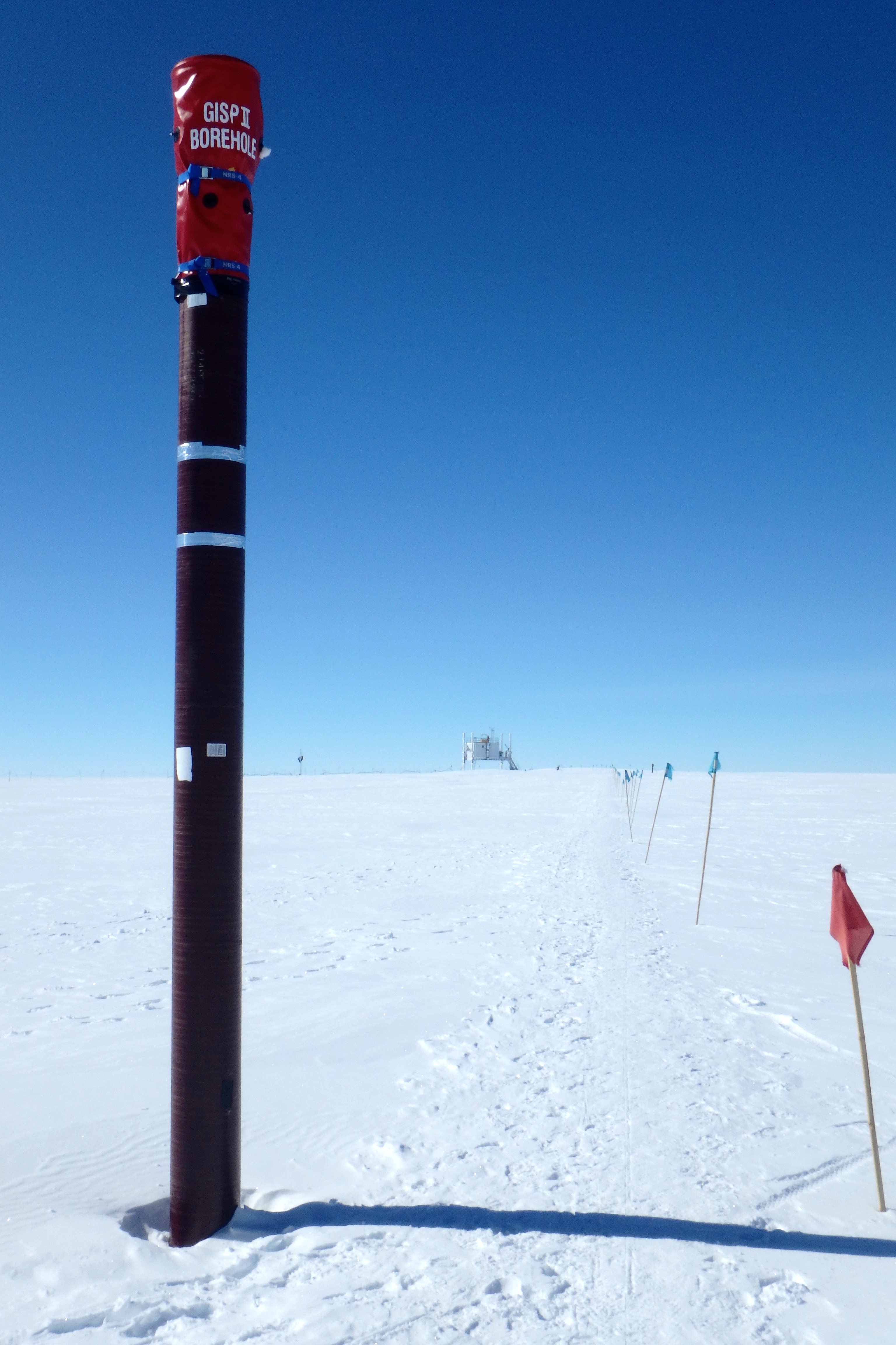 This monument was erected at the site of the bore hole for the GISP2 project which in 1993, drilled all the way through the Greenland Ice Sheet, 3053 meters deep, down to bedrock. Summit Station, Greenland.