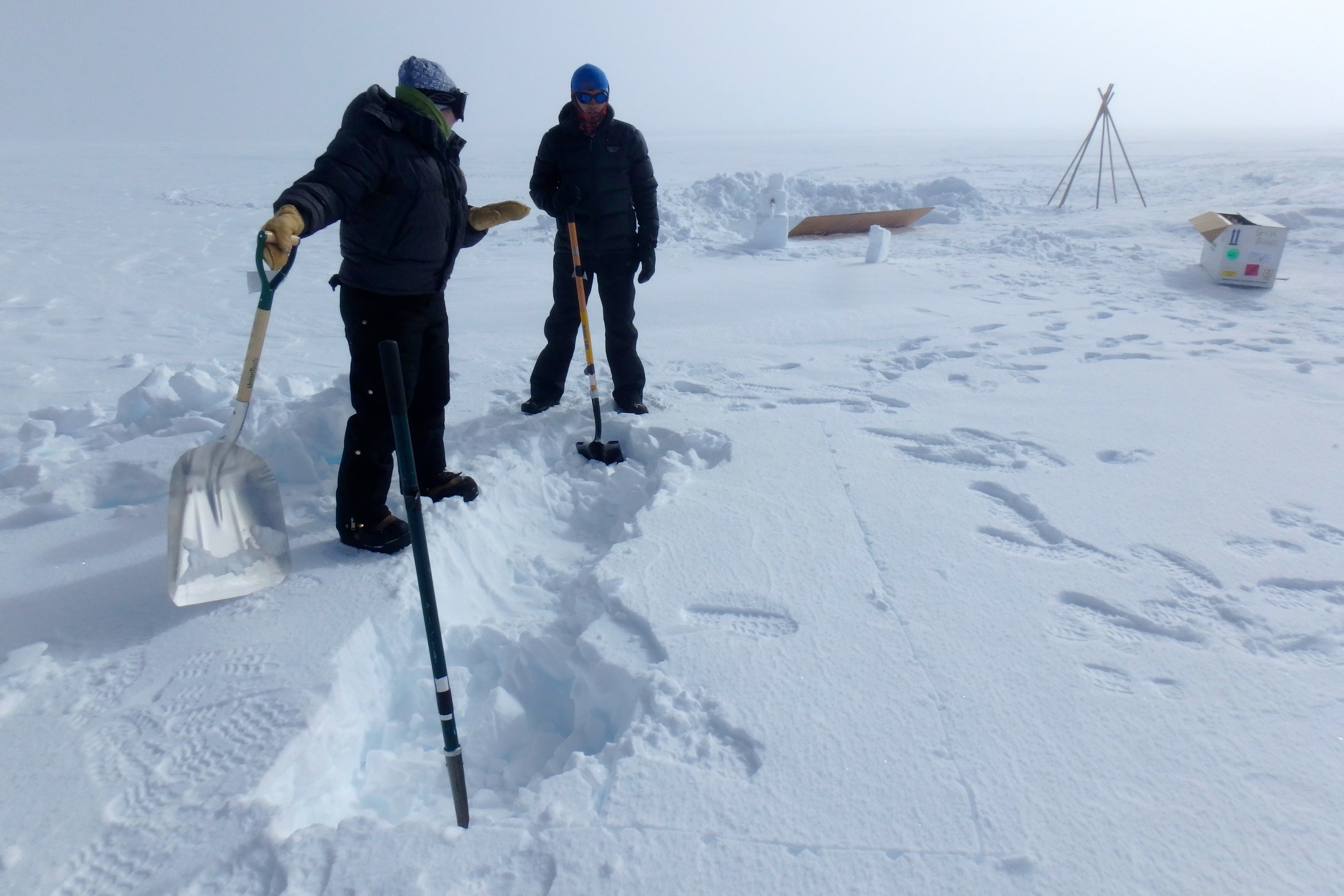 Eric Wagner and Heather McIntyre begin digging a 2 meter snow pit in order to take samples of the firn. Near Summit Station, Greenland.