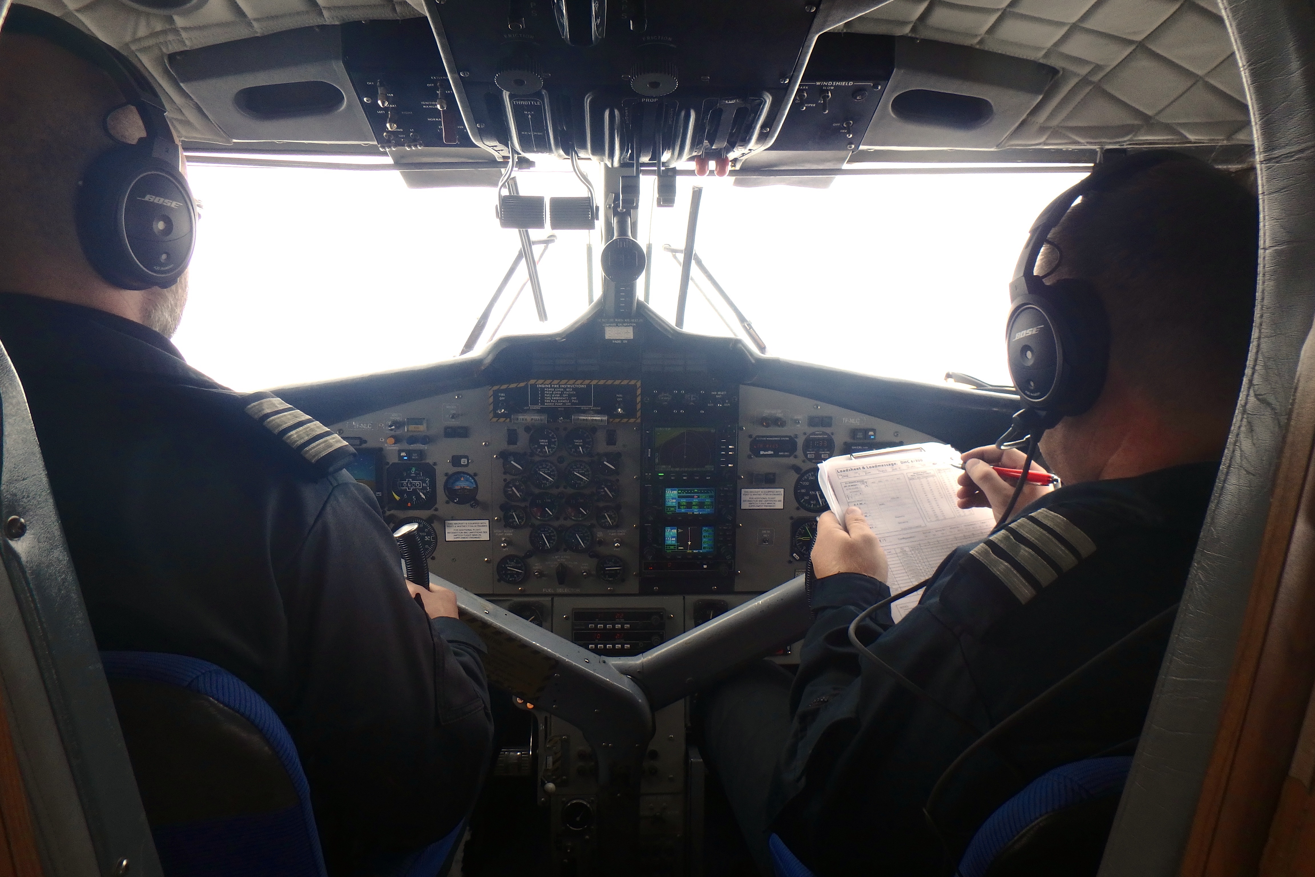 Two Icelandic pilots fly the Twin Otter airplane from Summit Station to a remote ice core cache on the Greenland Ice Sheet.