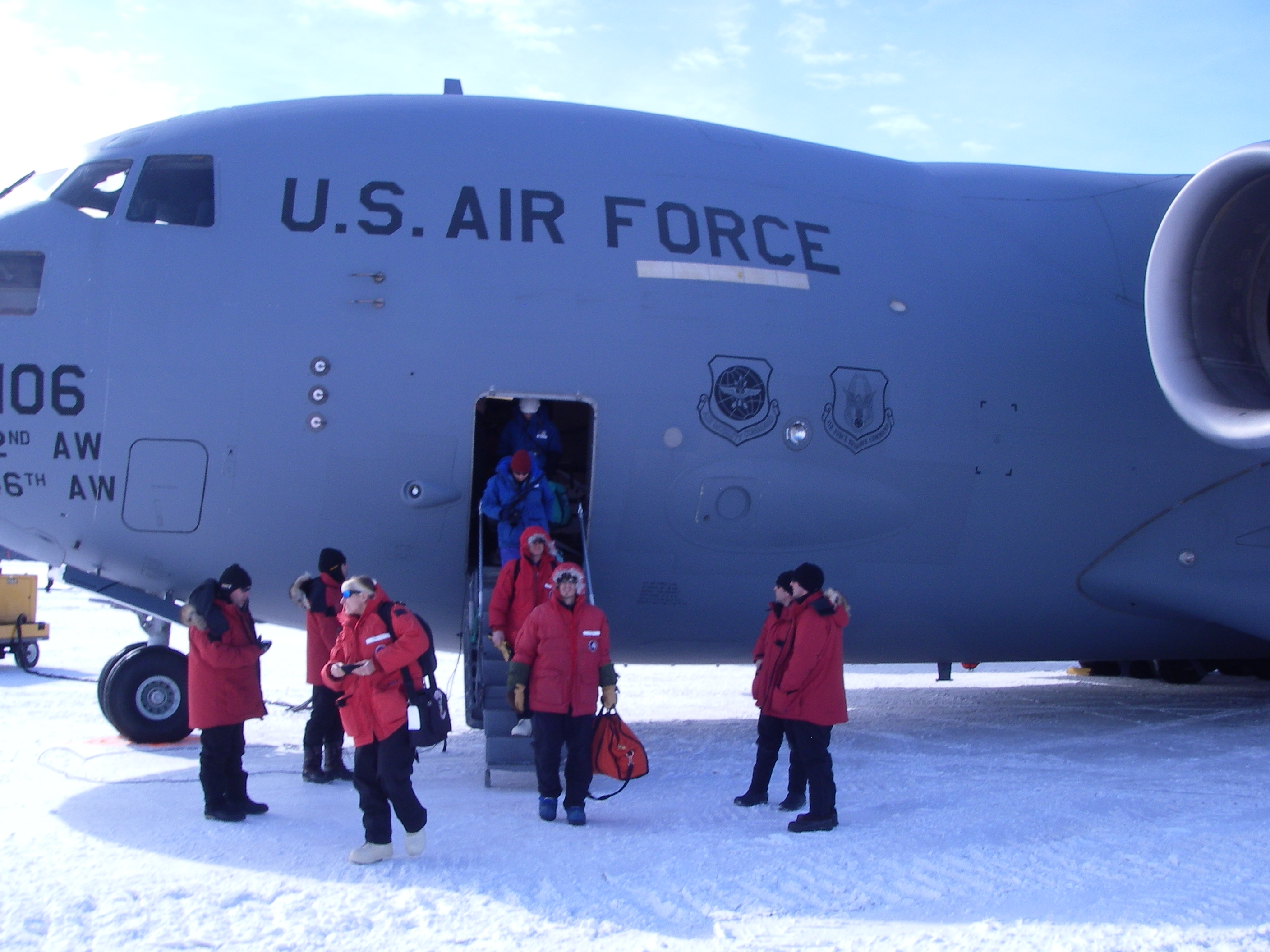 A look back at the C-17, just after arriving on the sea ice runway near McMurdo Station, Antarctica.