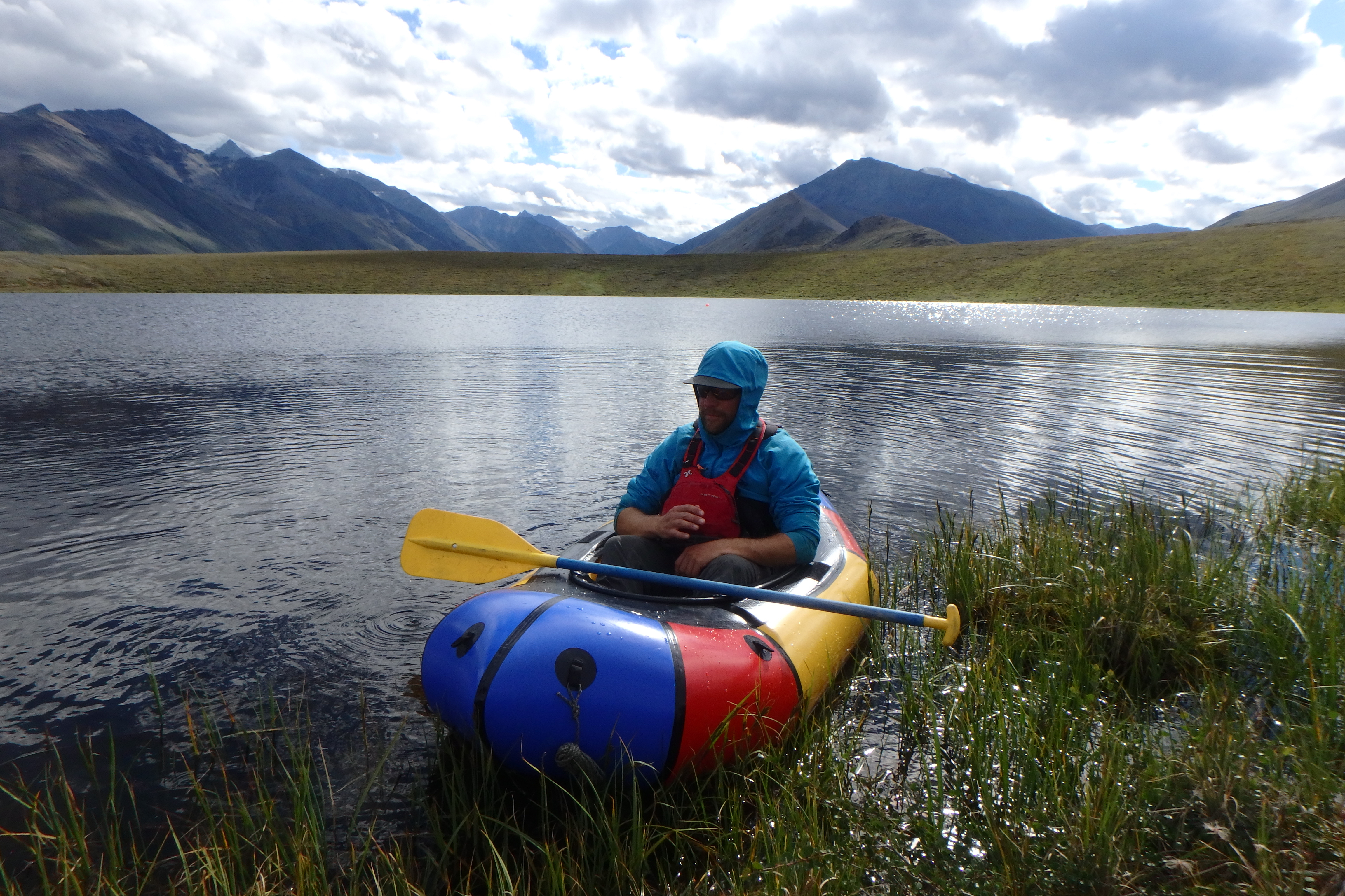 Chris Benson readies a packraft to collect samples on a pond near Lake Peters. Arctic National Wildlife Refuge, Alaska.