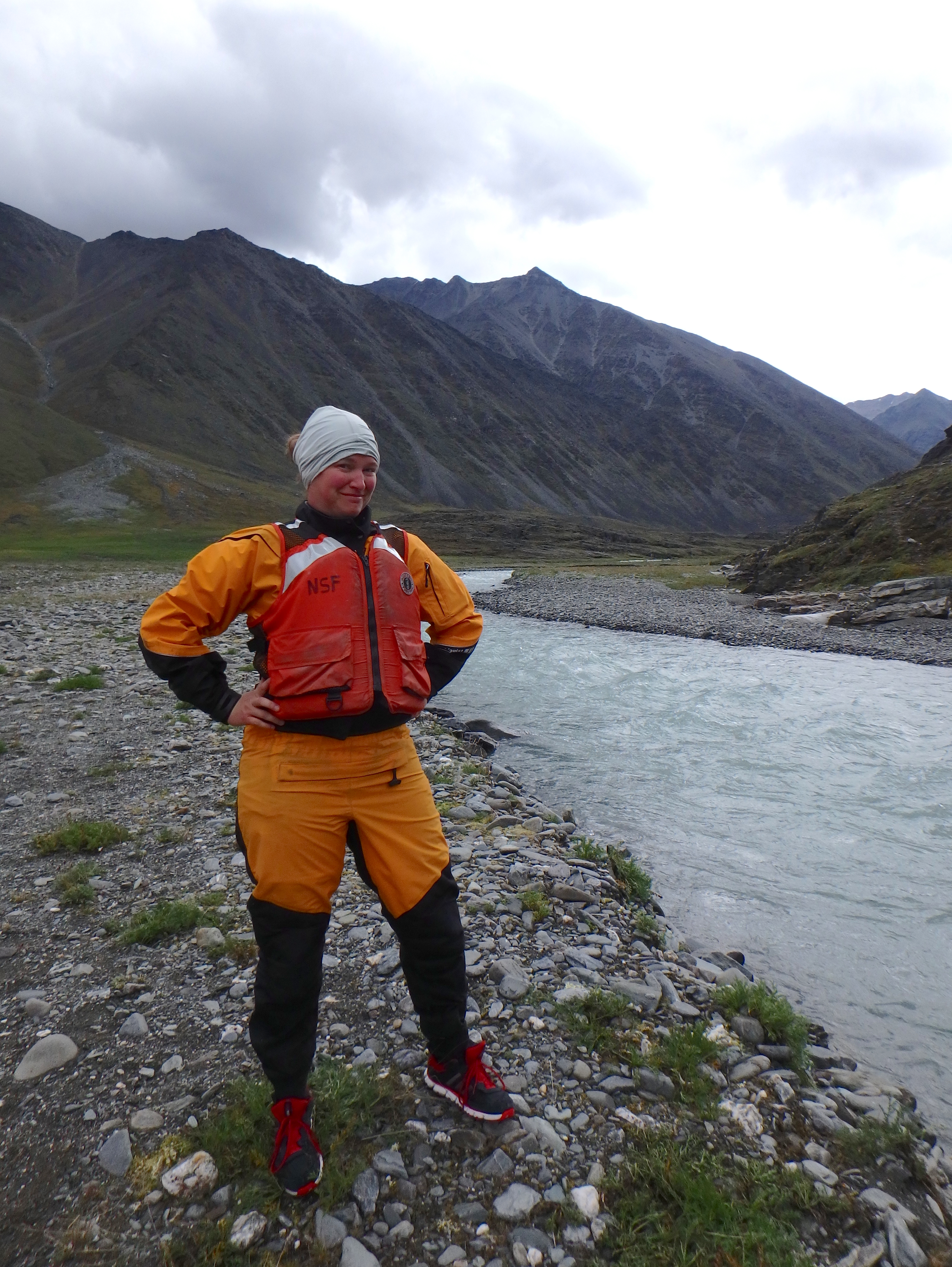 Rebecca Harris wears a dry suit and life jacket before she attempts to measure the discharge of Carnivore Creek. Brooks Range, Arctic National Wildlife Refuge, Alaska.