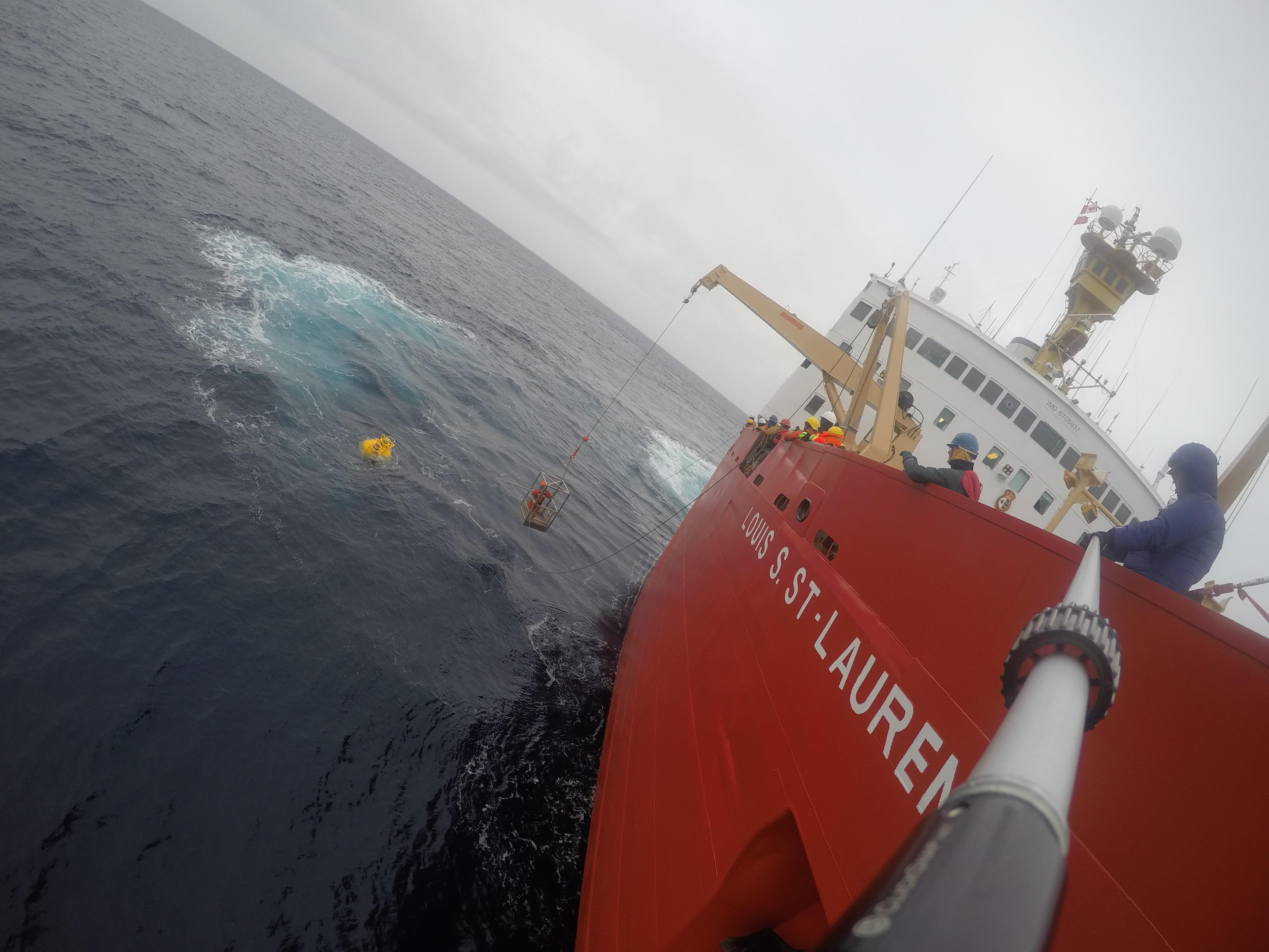 A mooring ball is chased down for recovery. Aboard the CCGS Louis S. St-Laurent in the Beaufort Sea.