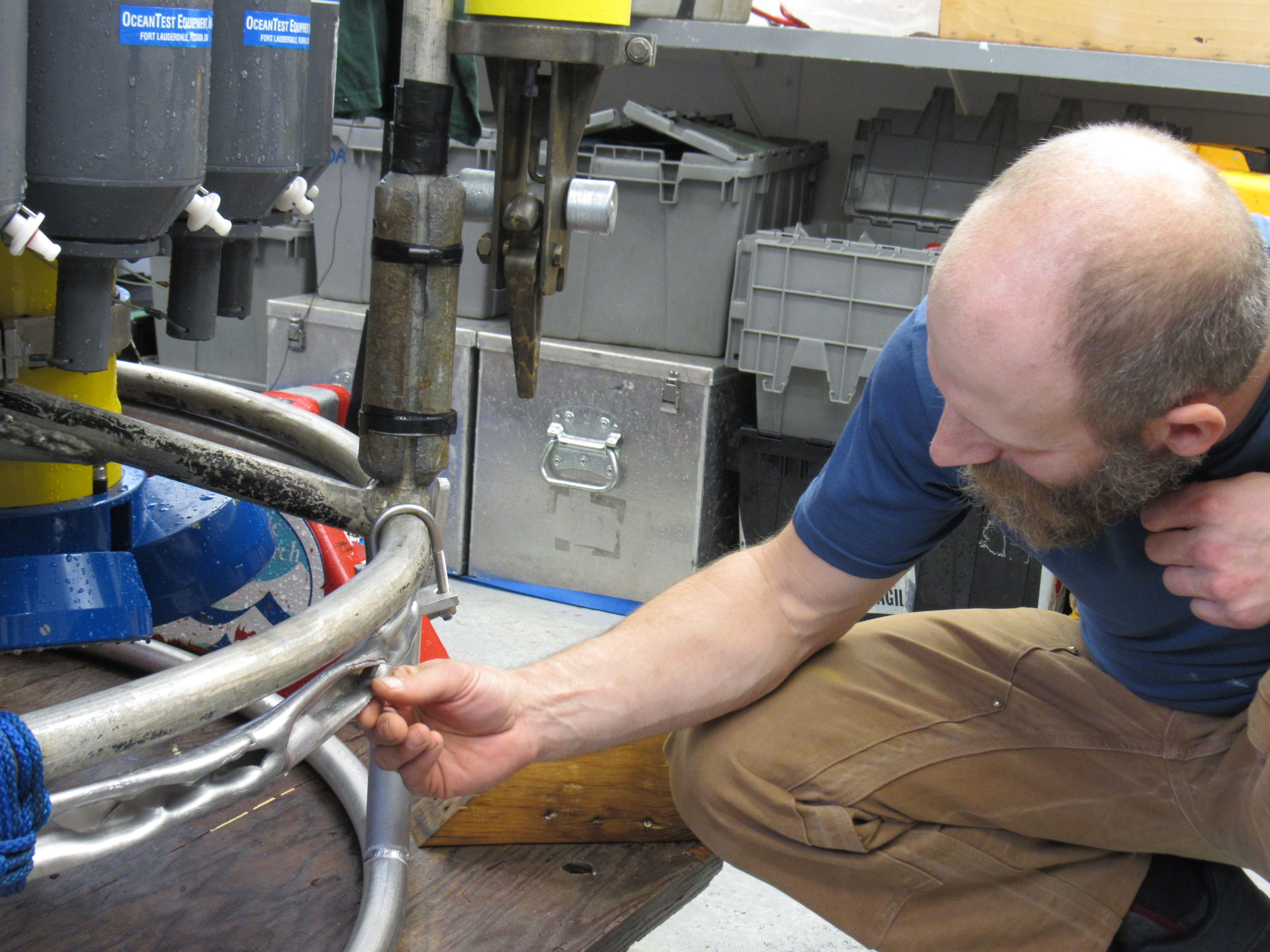 Josh Mitchell inspects the imploded rosette frame. Aboard the CCGS Louis S. St-Laurent in the Beaufort Sea.
