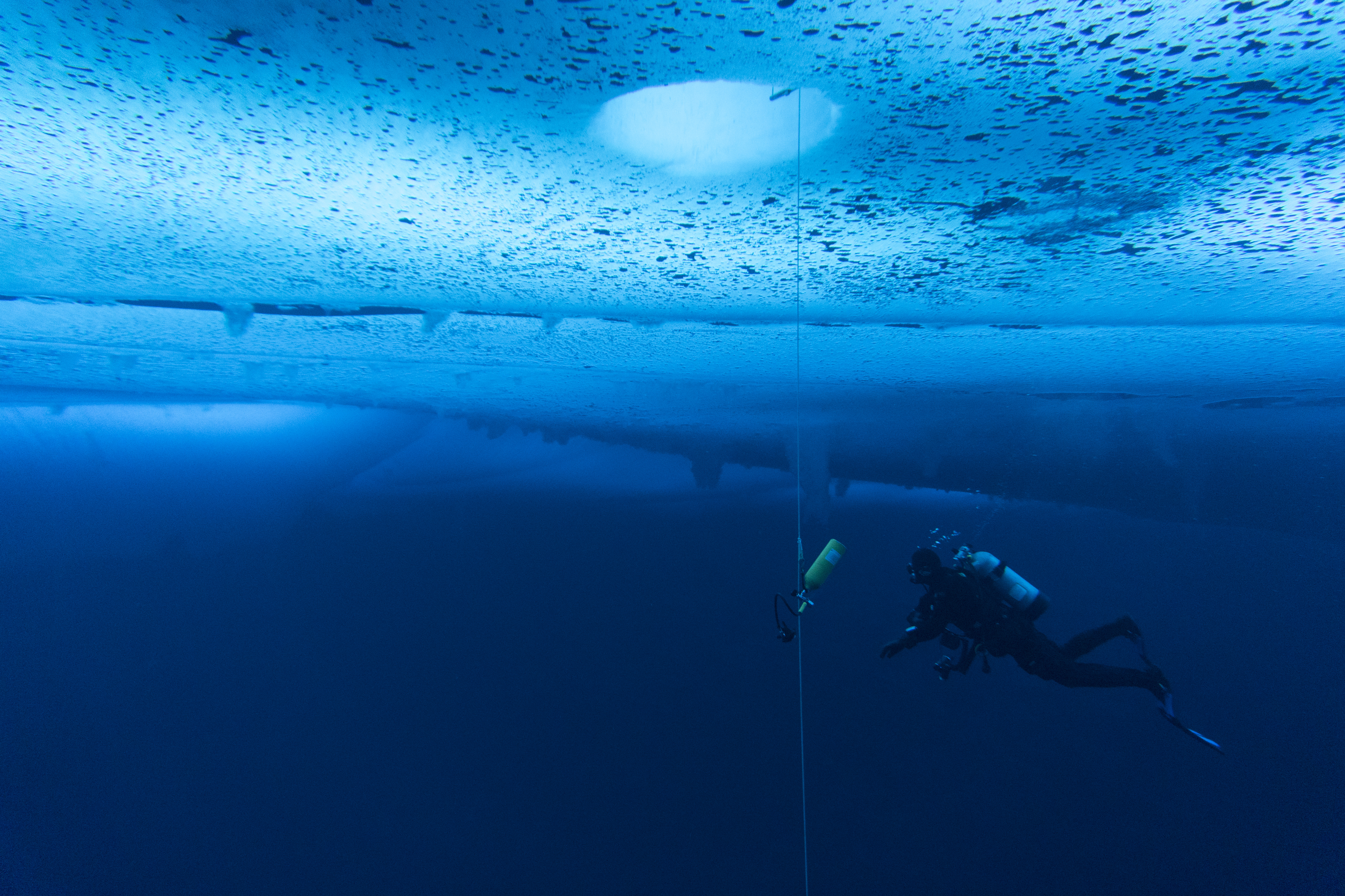 Dr. Bret Tobalske floats near the exit hole at 15ft (5m) during his three minute safety stop. Cape Evans, Antarctica.