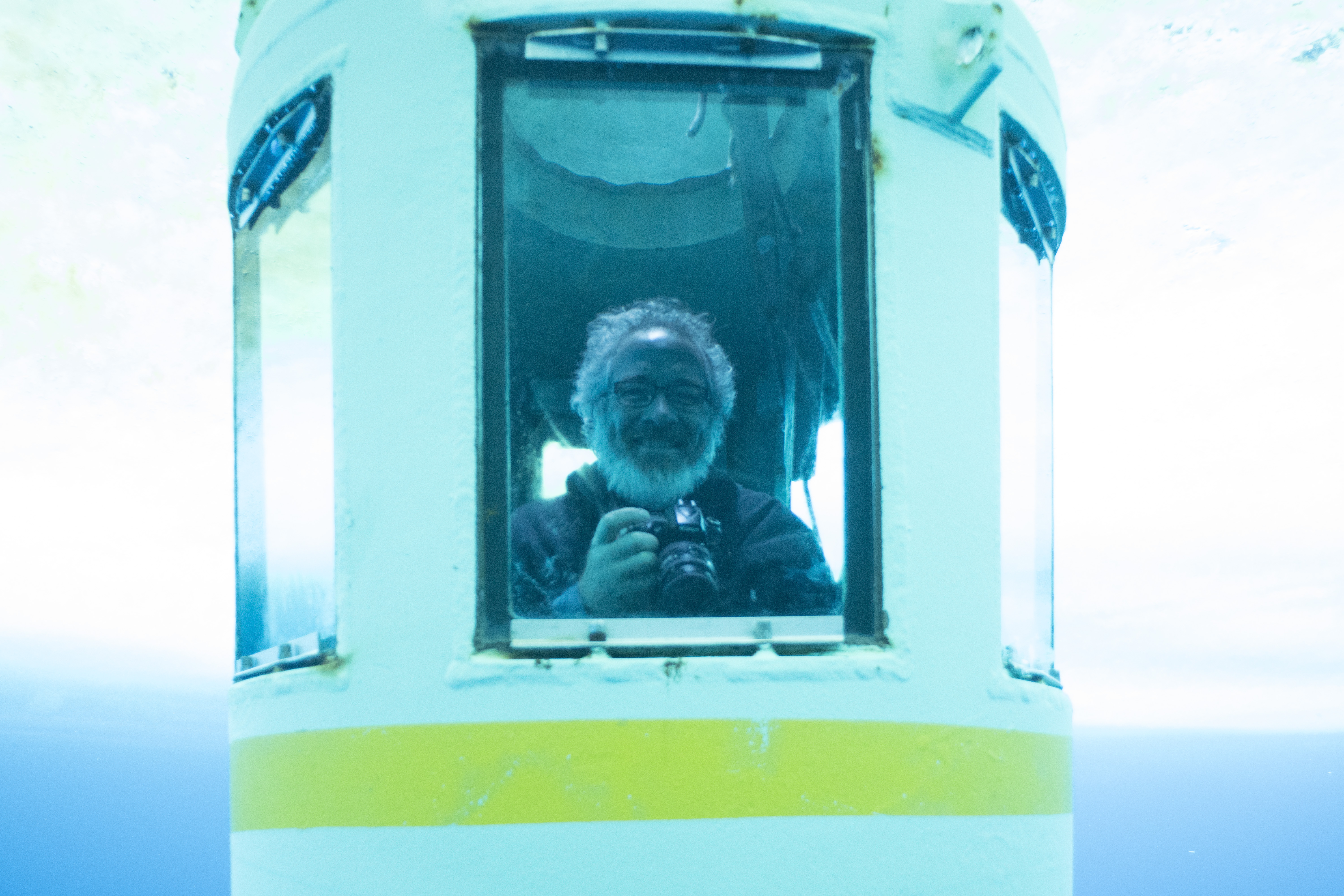 Artist and Writers Fellow Professor Glenn McClure draws inspiration from observing divers from inside the observation tube. McMurdo Station, Antarctica.