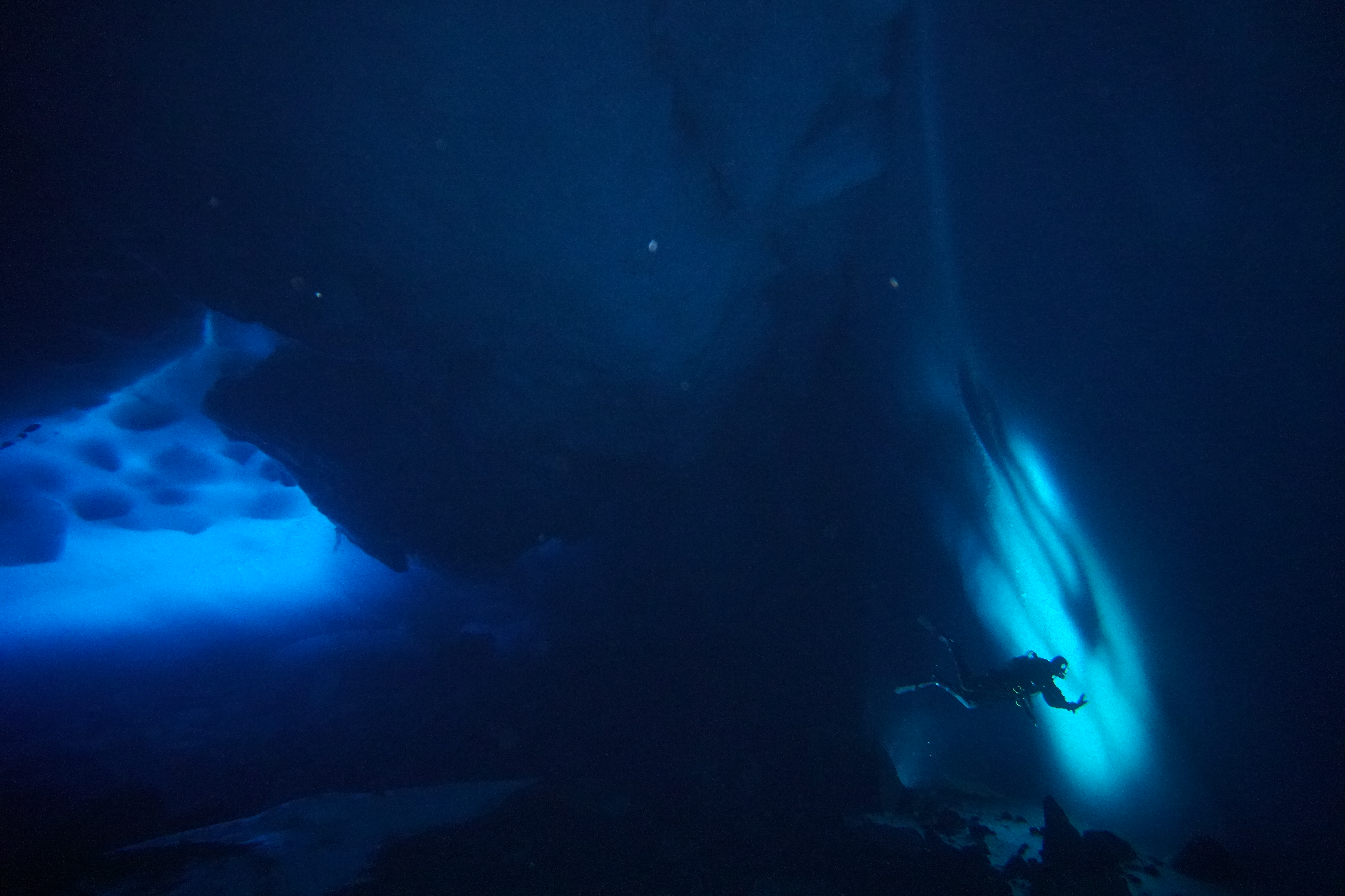 Taking a break from sea spider collections, Steve Lane swims up to the grounding line of the Barne Glacier, 50ft (15m) underwater. Cape Evans, Antarctica.