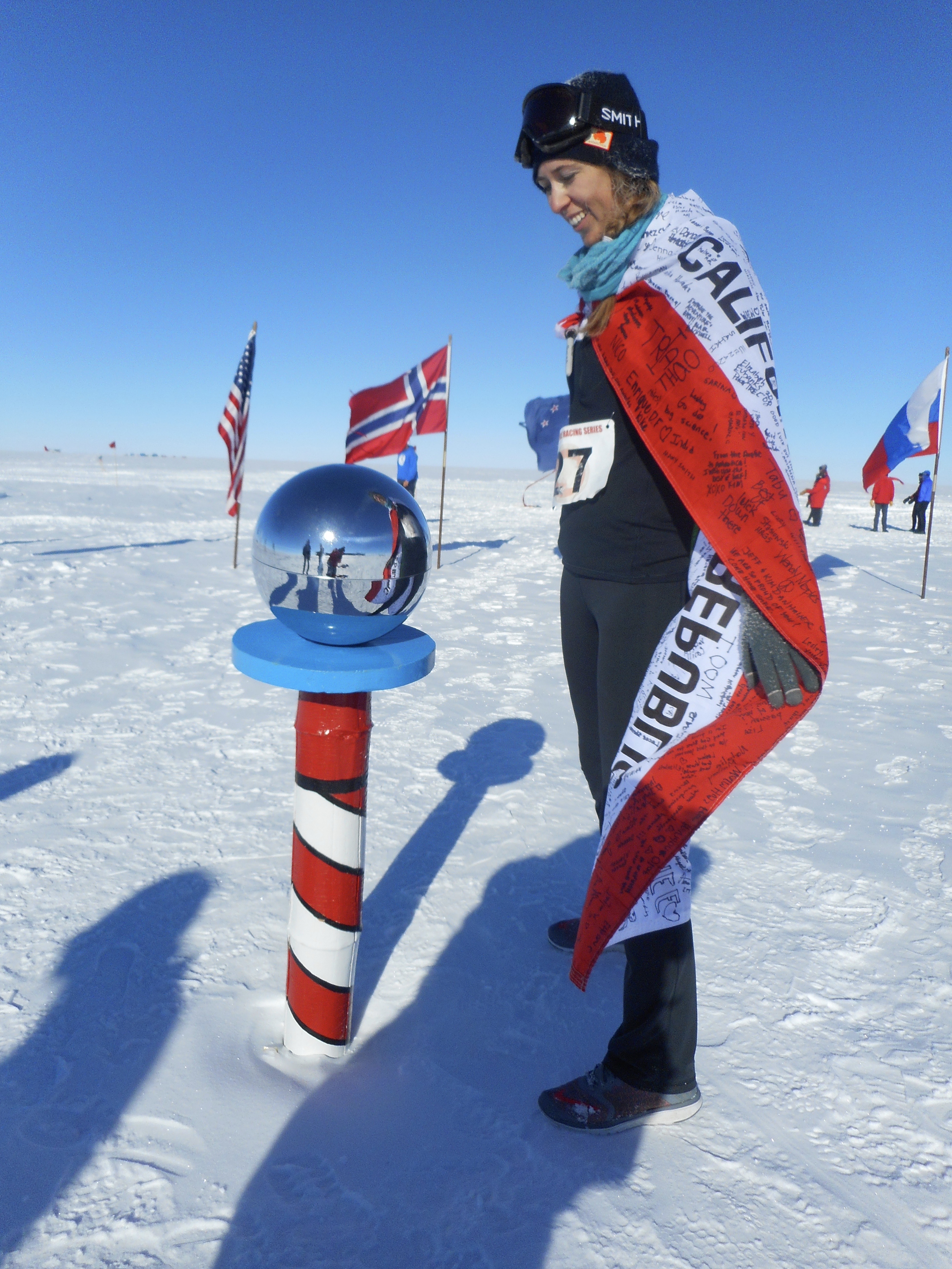 Lesley Anderson: "Catching my breath at the Ceremonial South Pole marker after running every longitude in the world." Amundsen-Scott South Pole Station, Antarctica.
