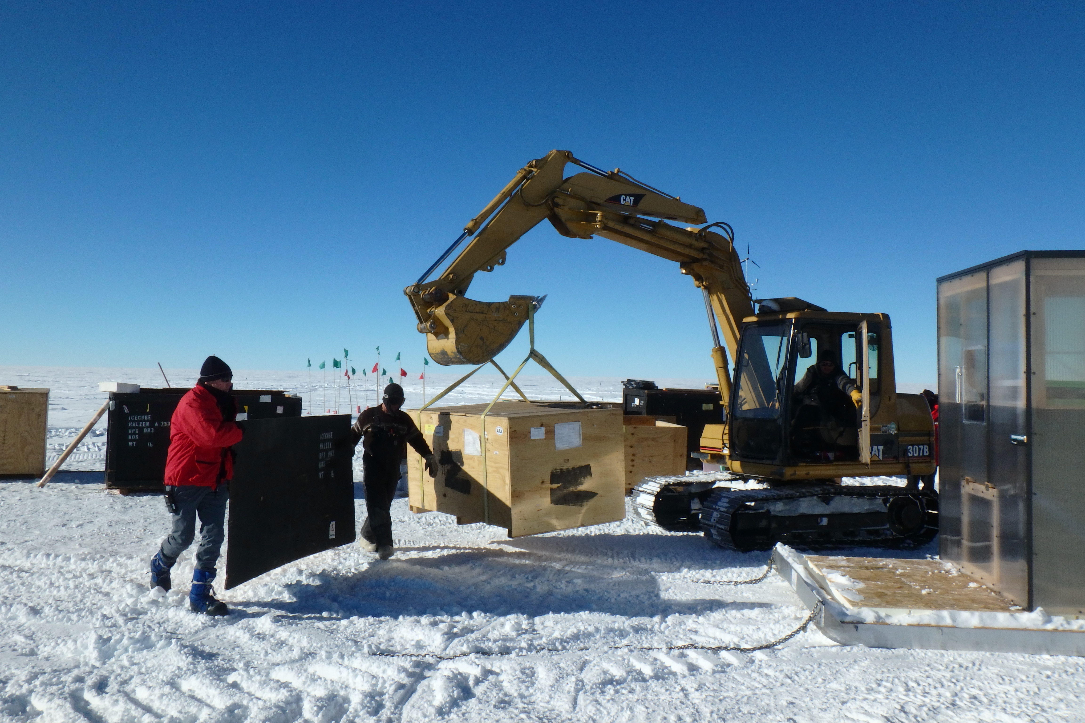 Josiah Heiser moves a crate of Askaryan Radio Array (ARA) supplies with an excavator. Amundsen-Scott South Pole Station, Antarctica.