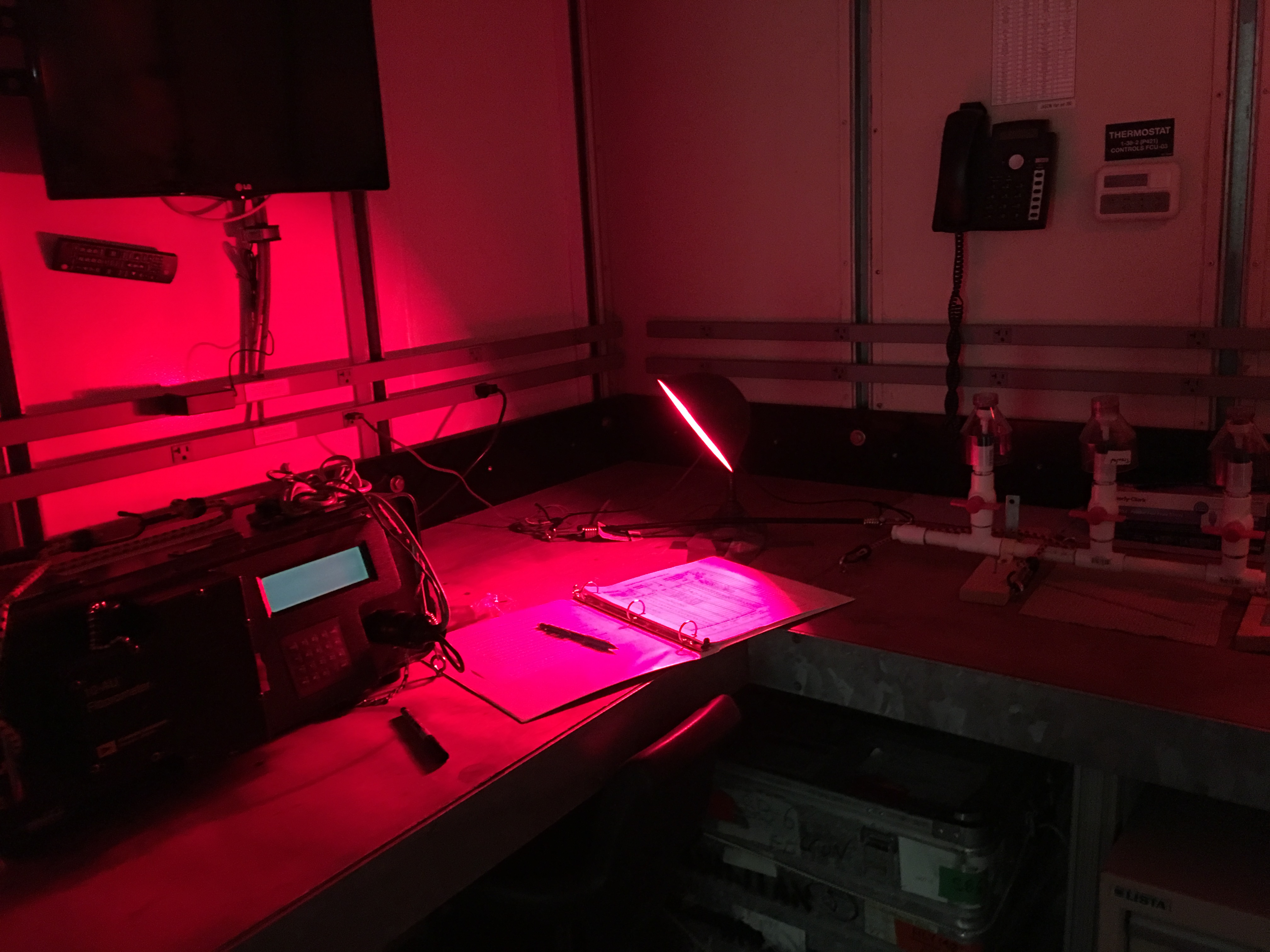 Red lights are used in the analysis lab during chlorophyll work to protect the chlorophyll samples from degrading. Aboard the R/V Sikuliaq in the Beaufort Sea.