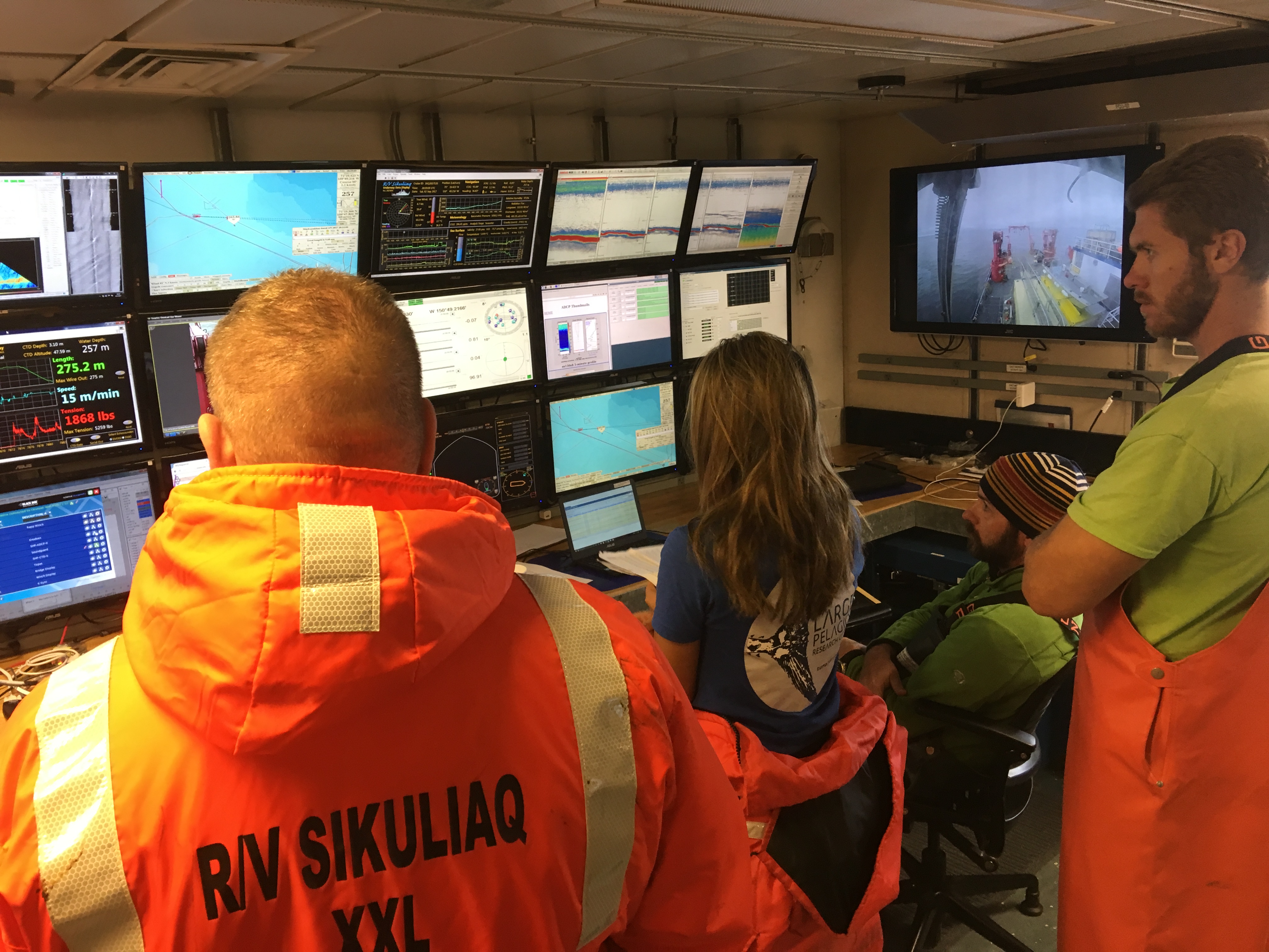 Dr. Joel Llopiz and 'Team Fish' watch the computer panels carefully to monitor their mid-water trawl net as it gets close to the bottom of the Beaufort Sea floor. Aboard the R/V Sikuliaq in the Beaufort Sea.