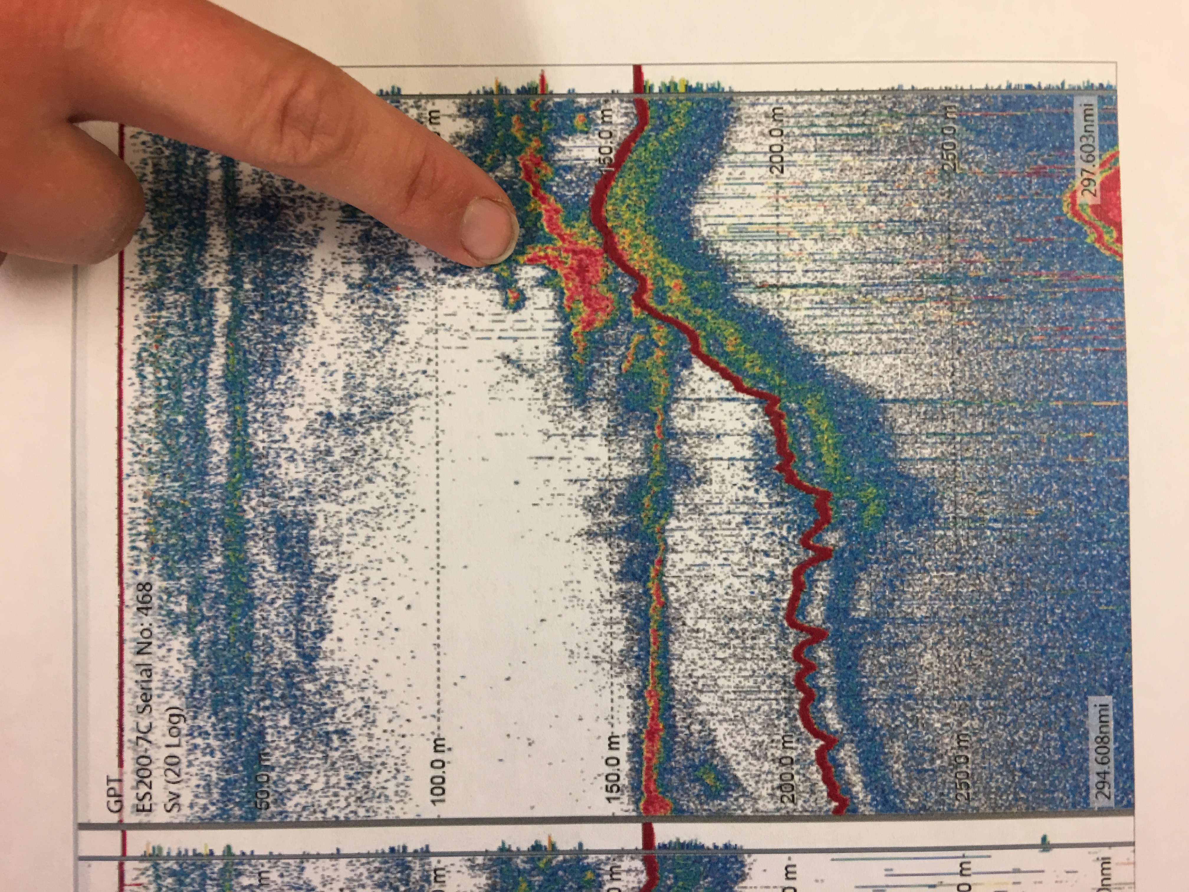 An EK 60 echogram used to locate krill before setting the bongo nets and tucker trawl. Dr. Kristina Kvile points to the location of a suspected krill swarm. Aboard the R/V Sikuliaq in the Beaufort Sea.
