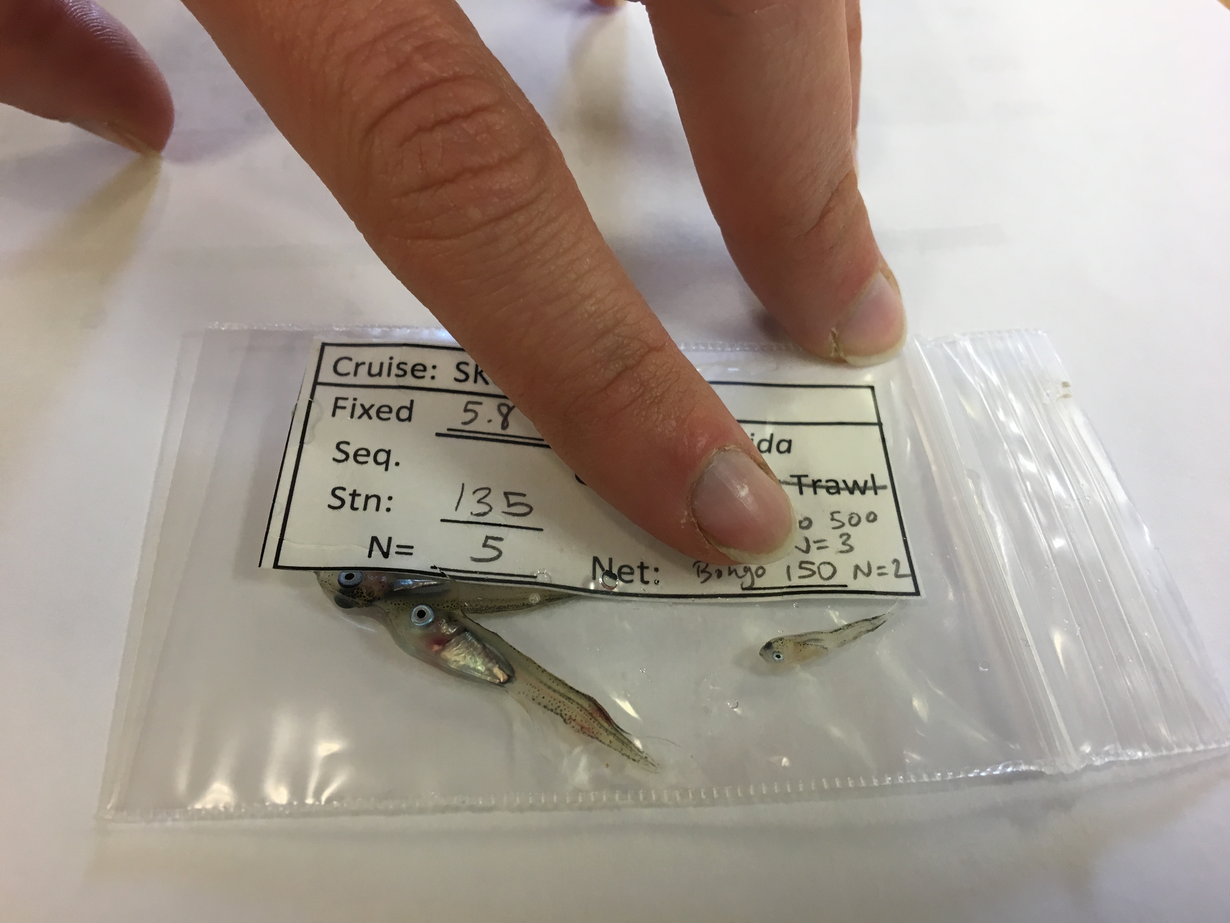 Small Arctic cod that were caught in the bongo nets. Aboard the R/V Sikuliaq in the Beaufort Sea.