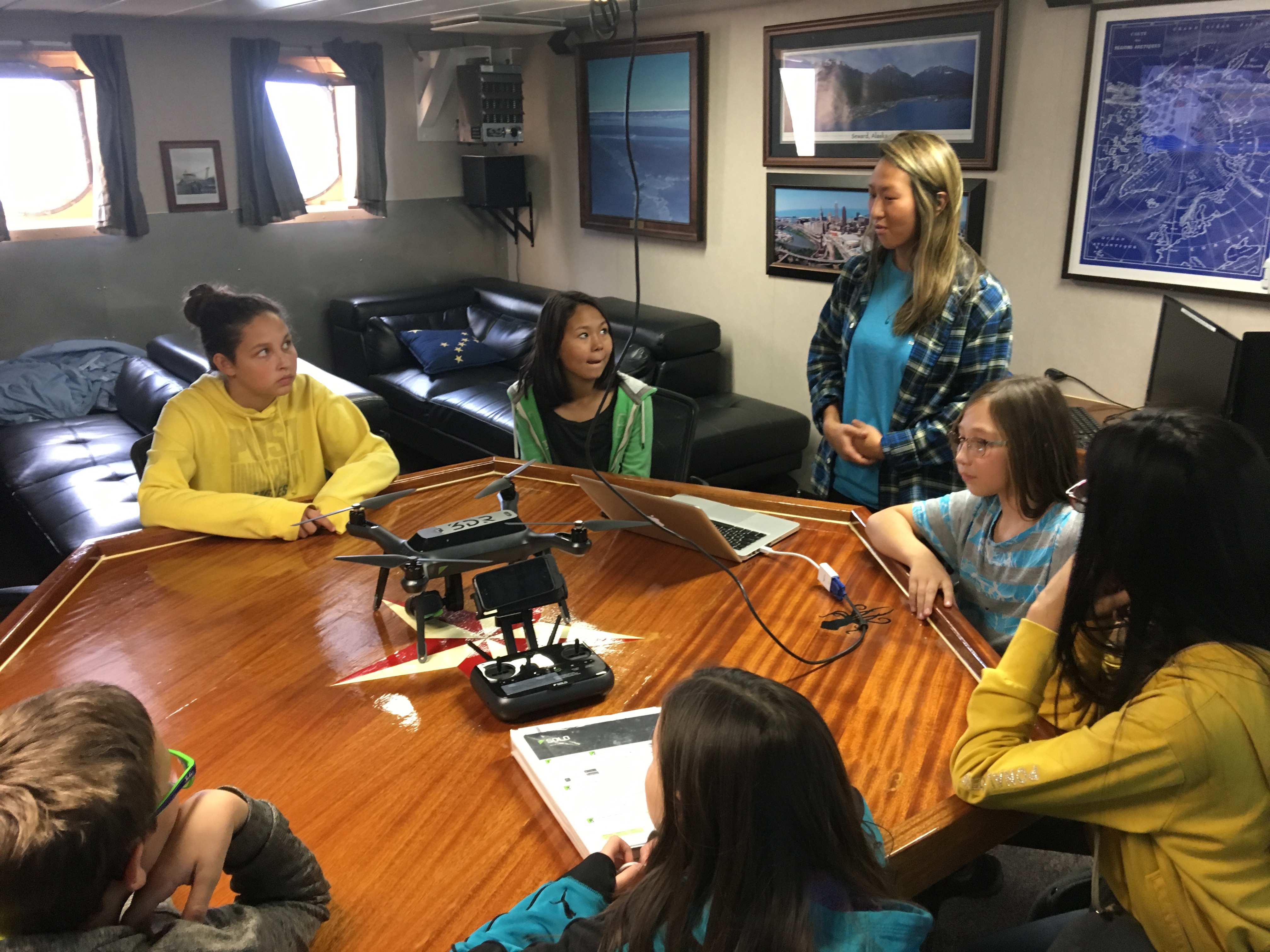 Students from the Anvil City Science Academy in Nome learn about drone job opportunities from Jennifer Johnson. Aboard the R/V Sikuliaq docked in Nome, Alaska.