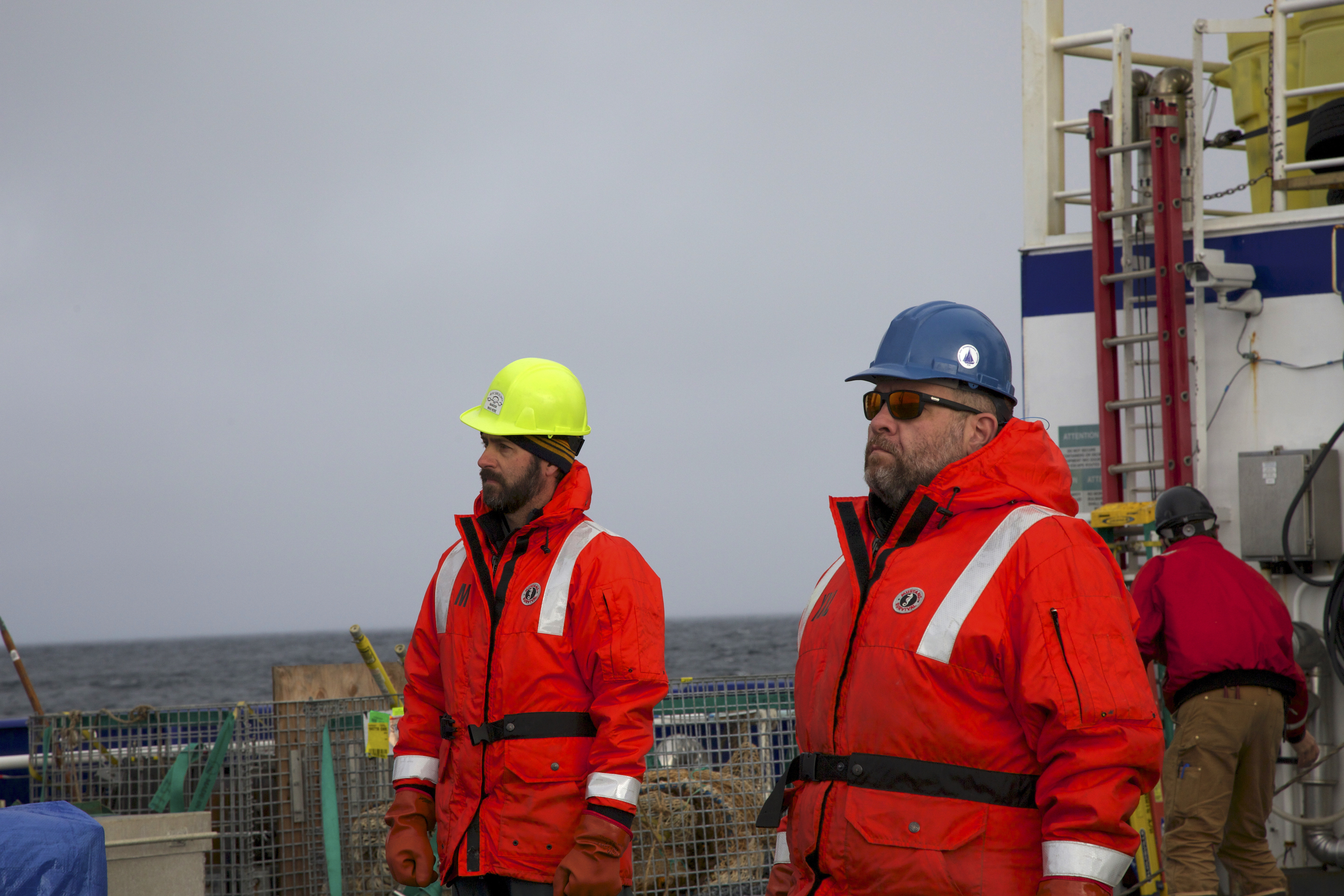 Dr. Joel Llopiz and Dr. Mike Lowe monitor the mid-water trawl net during its tow in the Beaufort Sea. Aboard the R/V Sikuliaq in the Beaufort Sea.