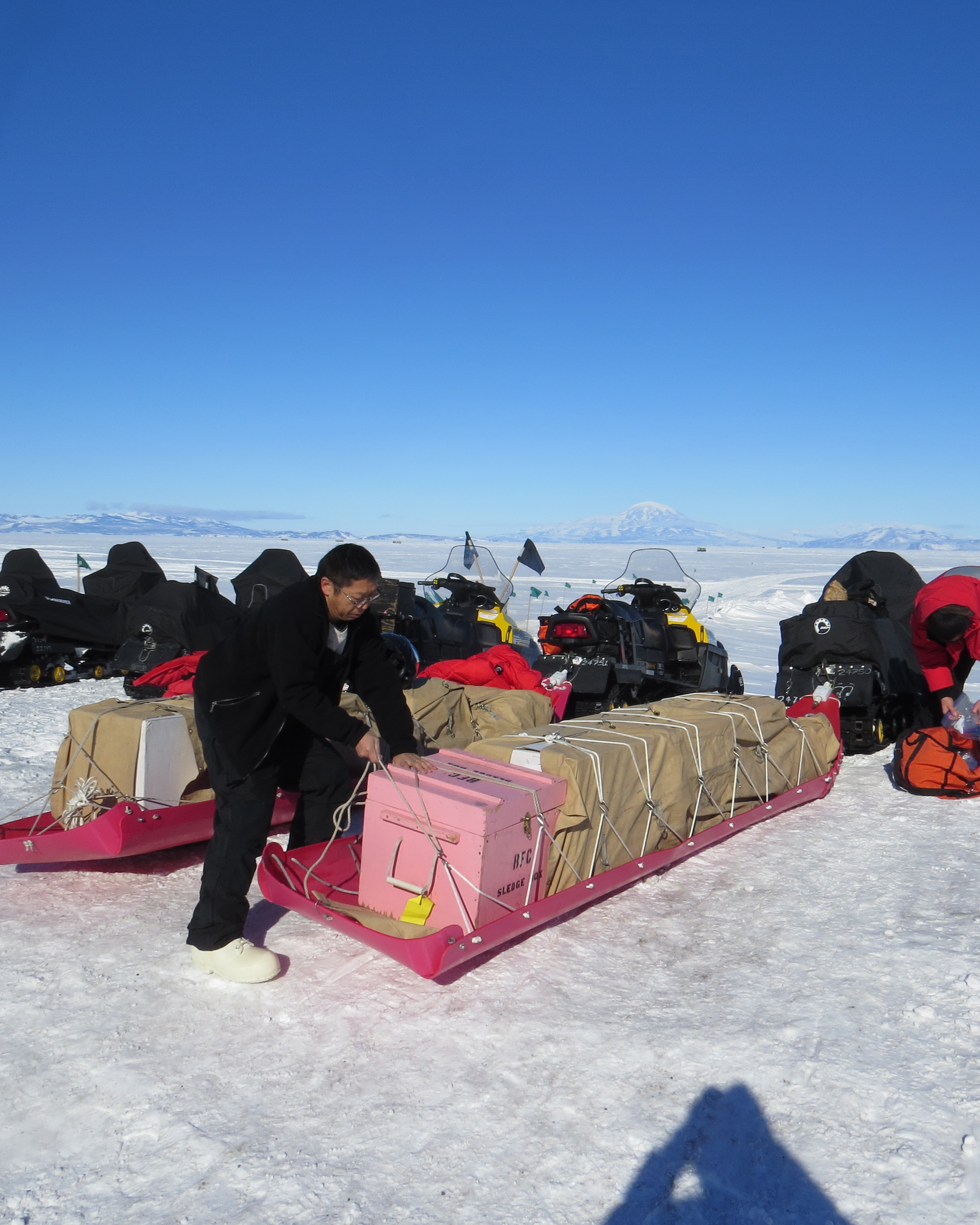 Hongjie Xie ties up a sledge to secure the equipment. McMurdo Station, Antarctica.