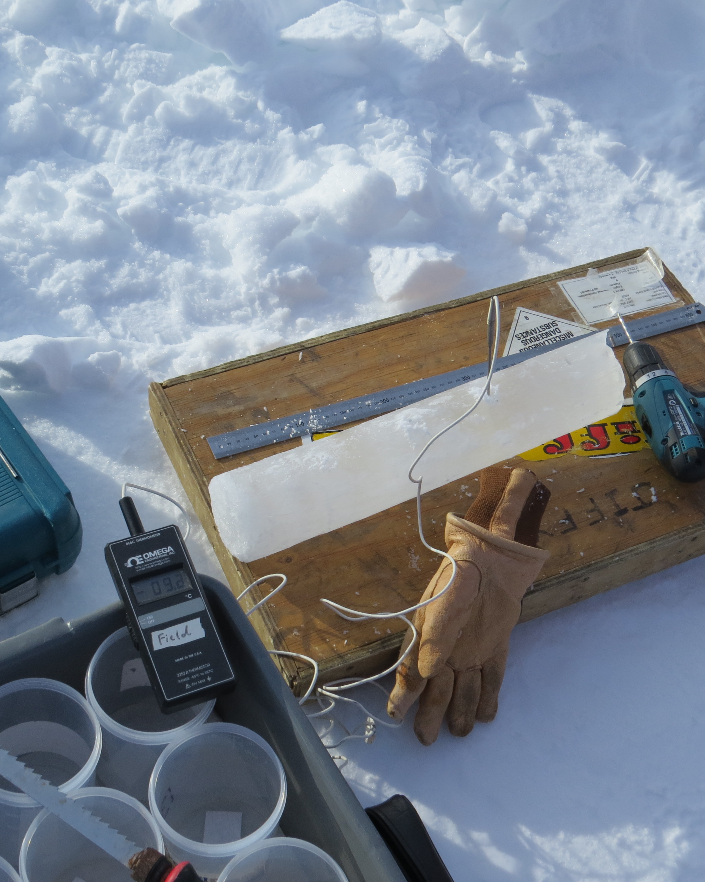 An ice core with a temperature probe with digital readout. The ruler is at the top of the core for measuring 10cm sections. On the sea ice of the Ross Sea, Antarctica.