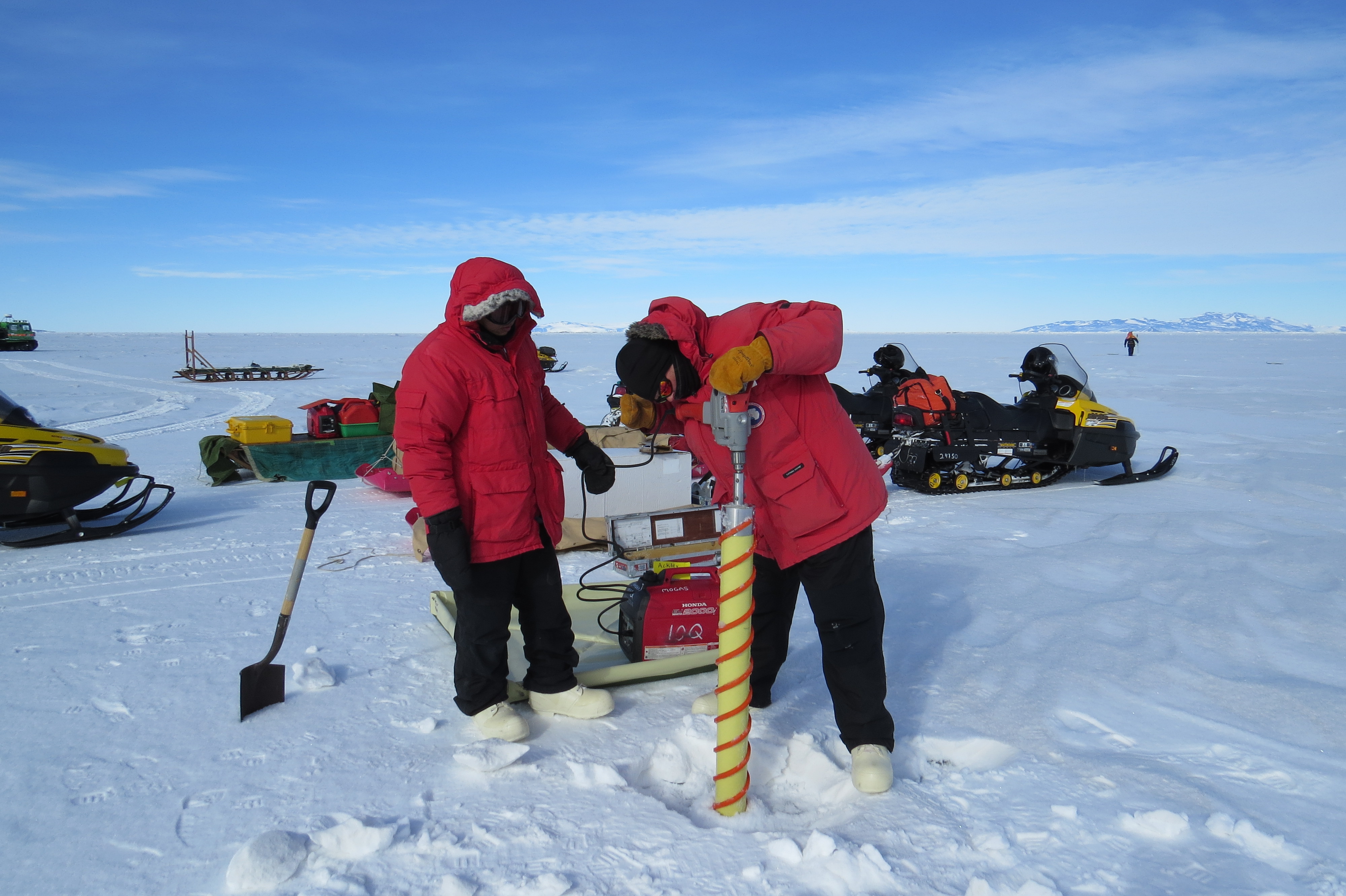 It is important to ensure that the corer is aligned straight. On the sea ice of the Ross Sea, Antarctica.