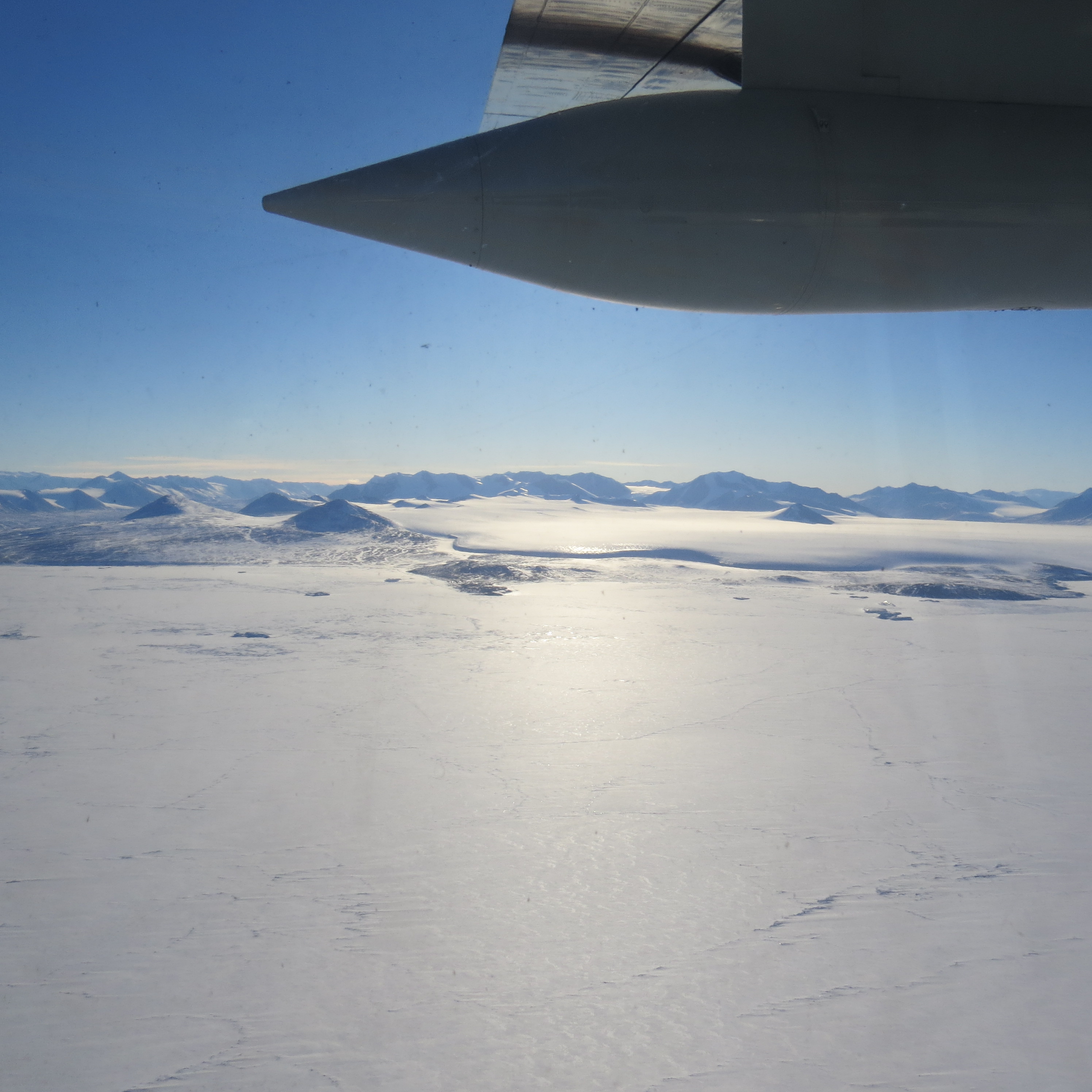 A glacier tongue meets the Ross Sea. The mountains in the background are part of the McMurdo Dry Valleys. Flying in an LC-130 over the Ross Sea, Antarctica.