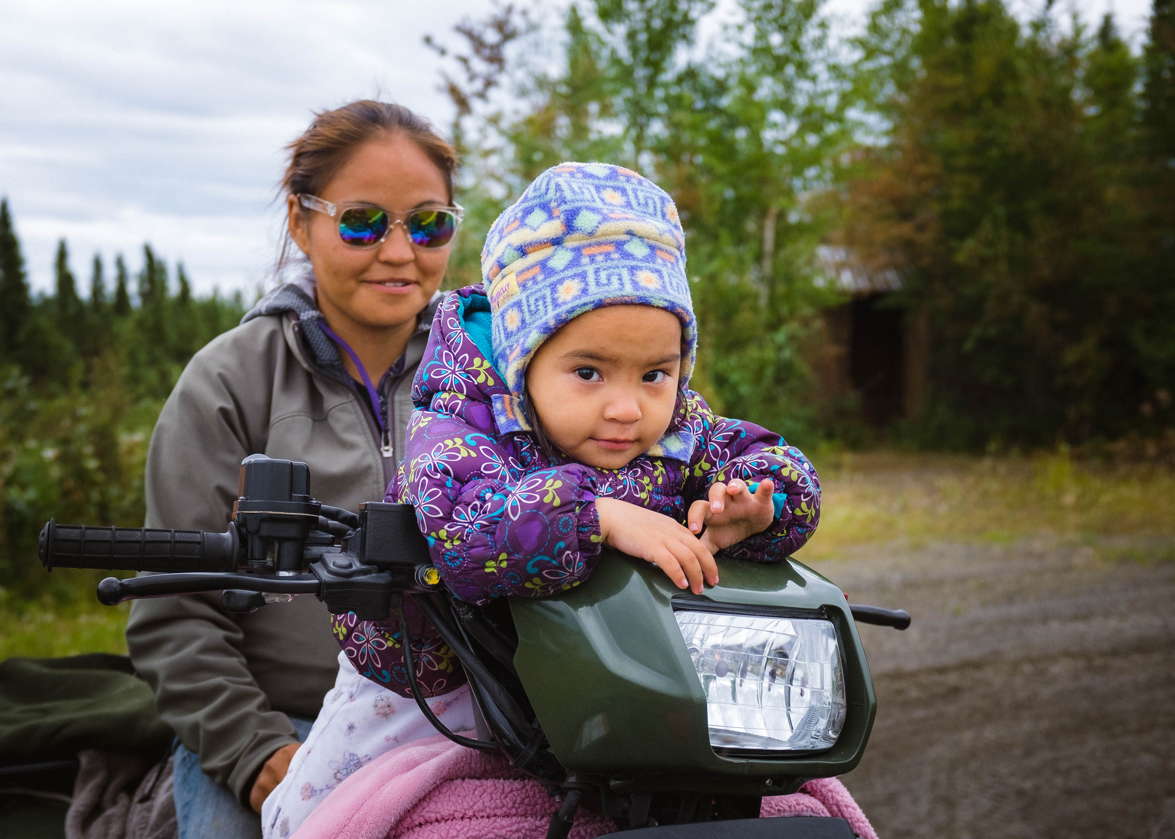 Nikolai residents Vicki and her daughter Talia hang out on an ATV. Nikolai, Alaska.
