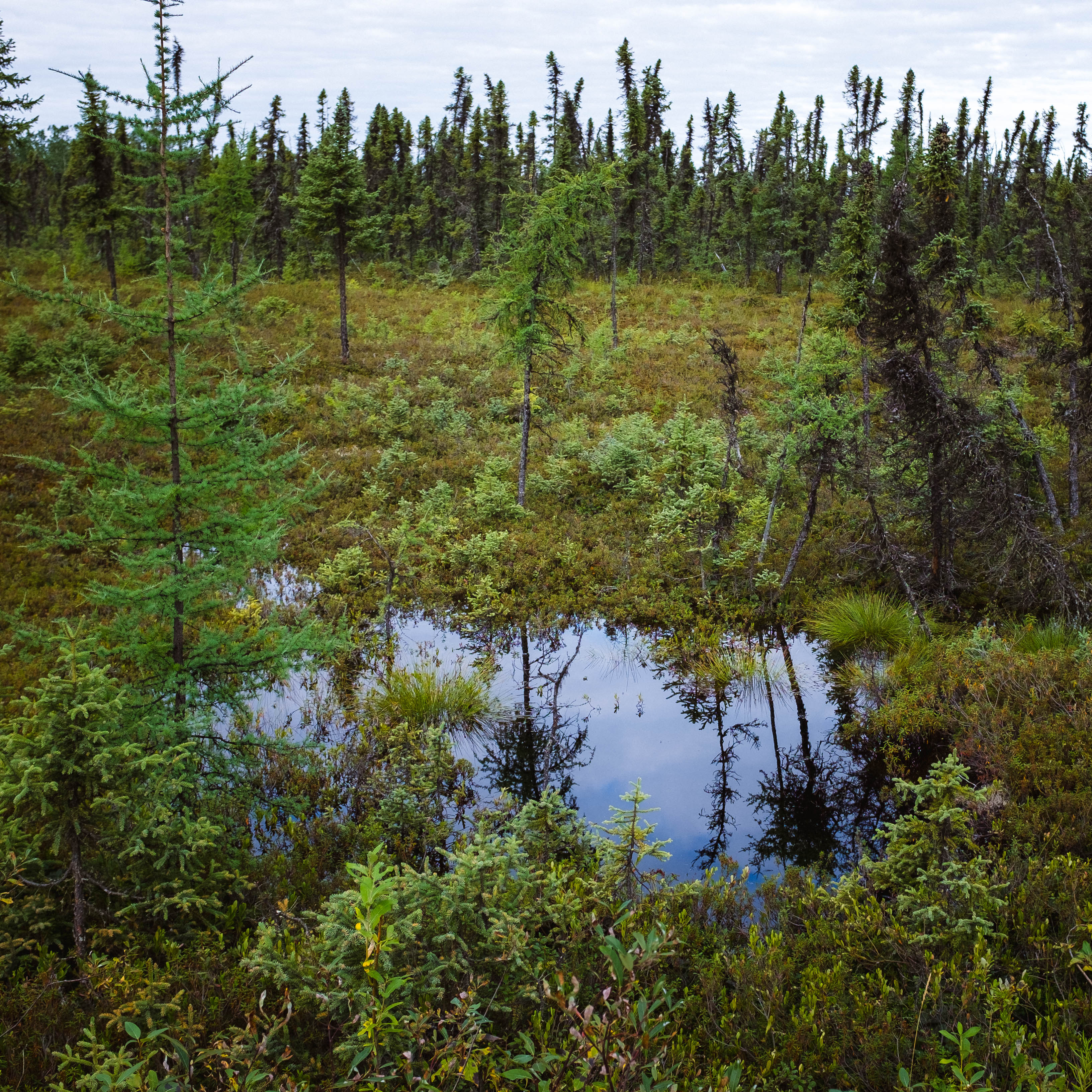 A thermokarst is formed when water seeps into the ground and thaws permafrost, which creates more water, which then melts even more permafrost. Nikolai, Alaska.