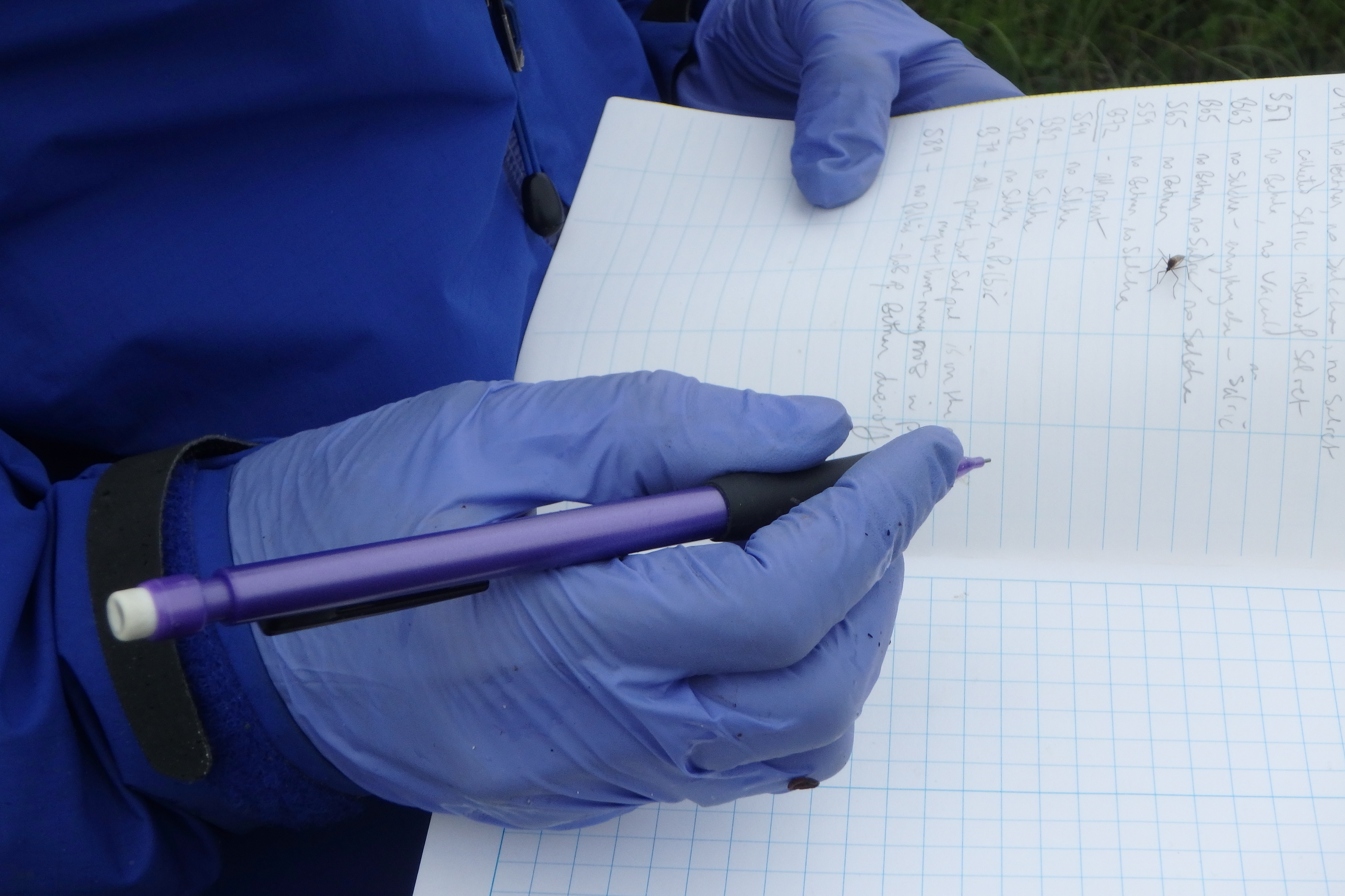 Dr. Bret-Harte writes in her field journal at the Riparian Snowfence field site. Toolik Field Station, Alaska.