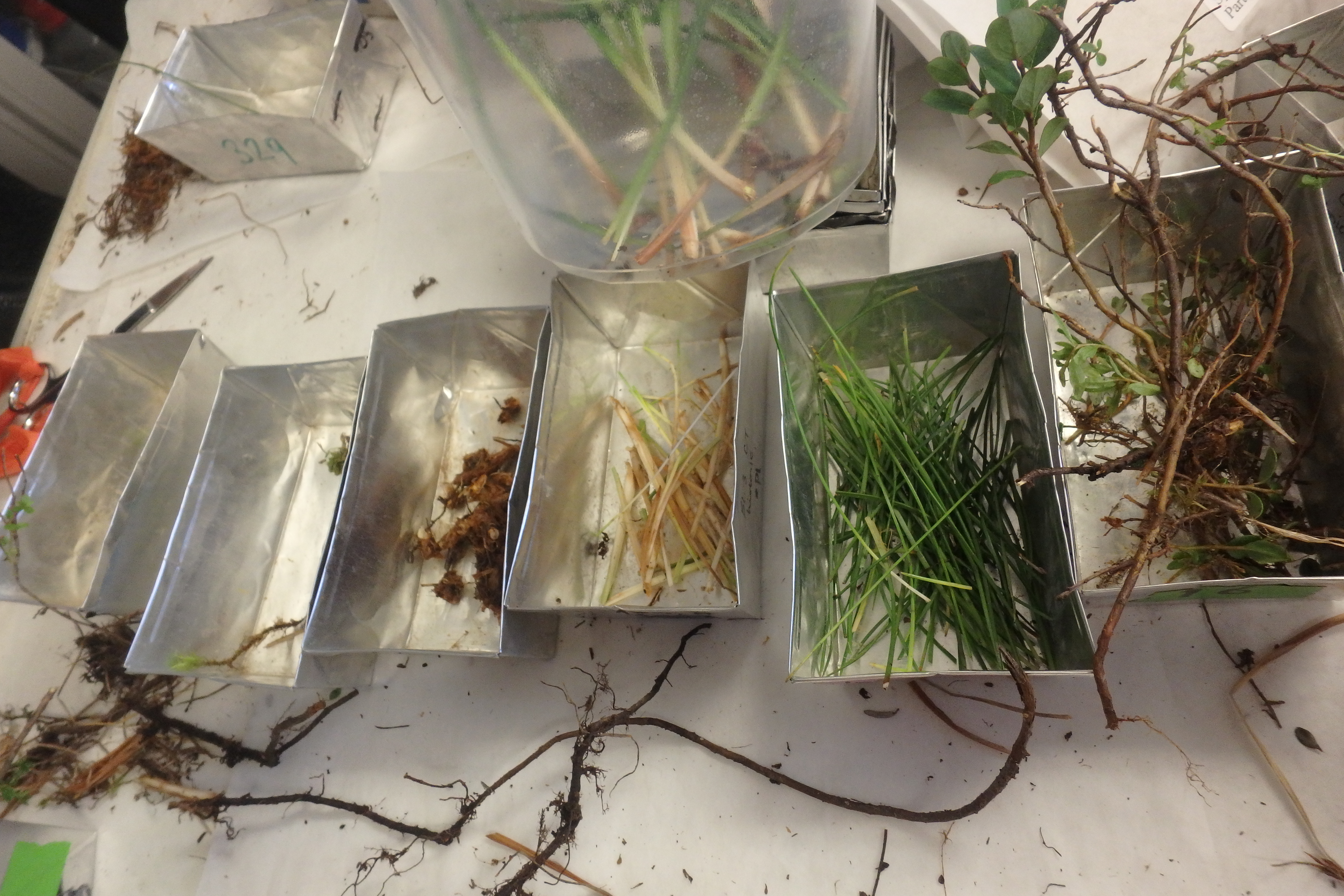 One of the tundra plants in the quadrat sample is divided up into specific parts of the plants. Toolik Field Station, Alaska.