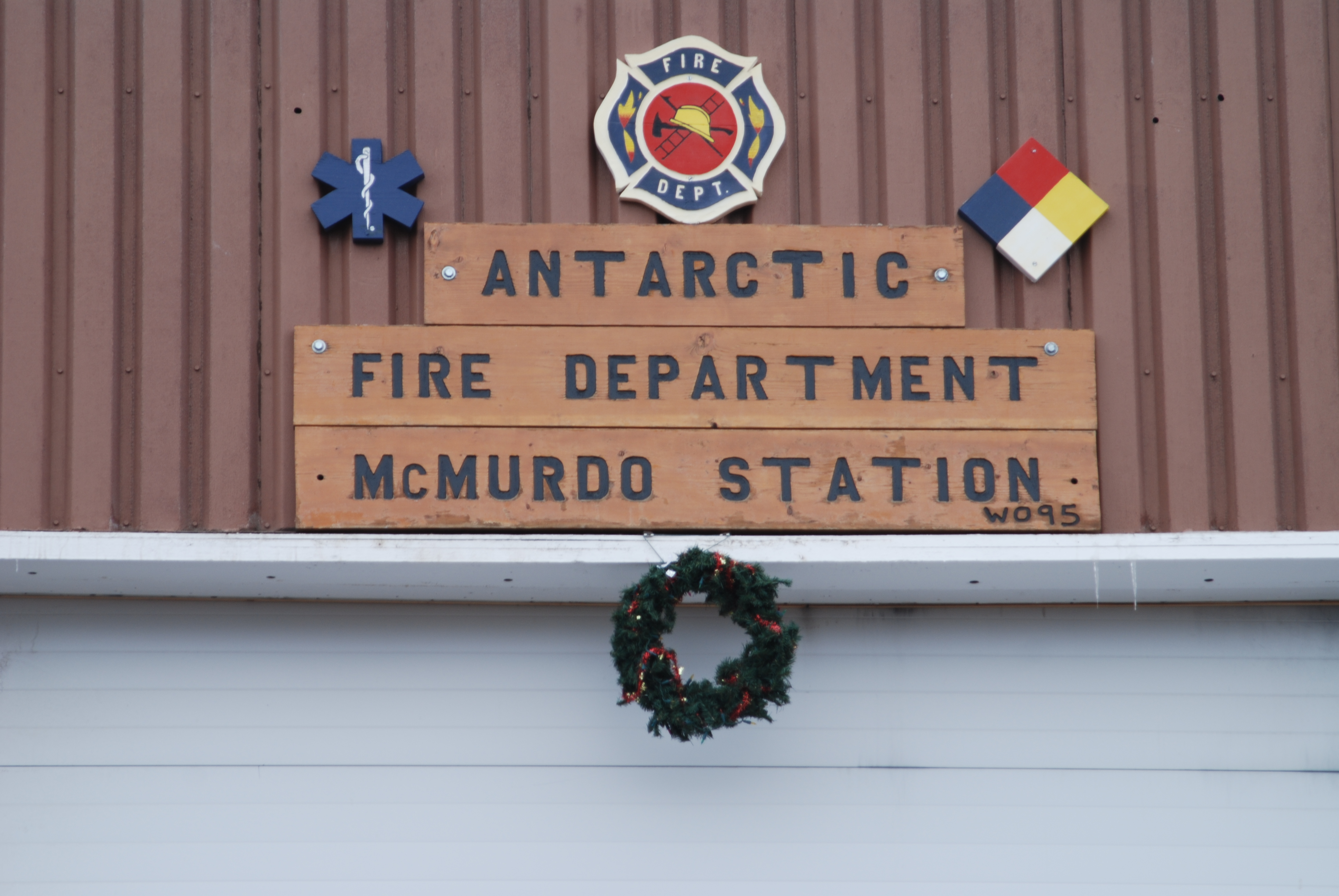 A Christmas wreath hanging off of the McMurdo Fire Department Sign. McMurdo Station, Antarctica.