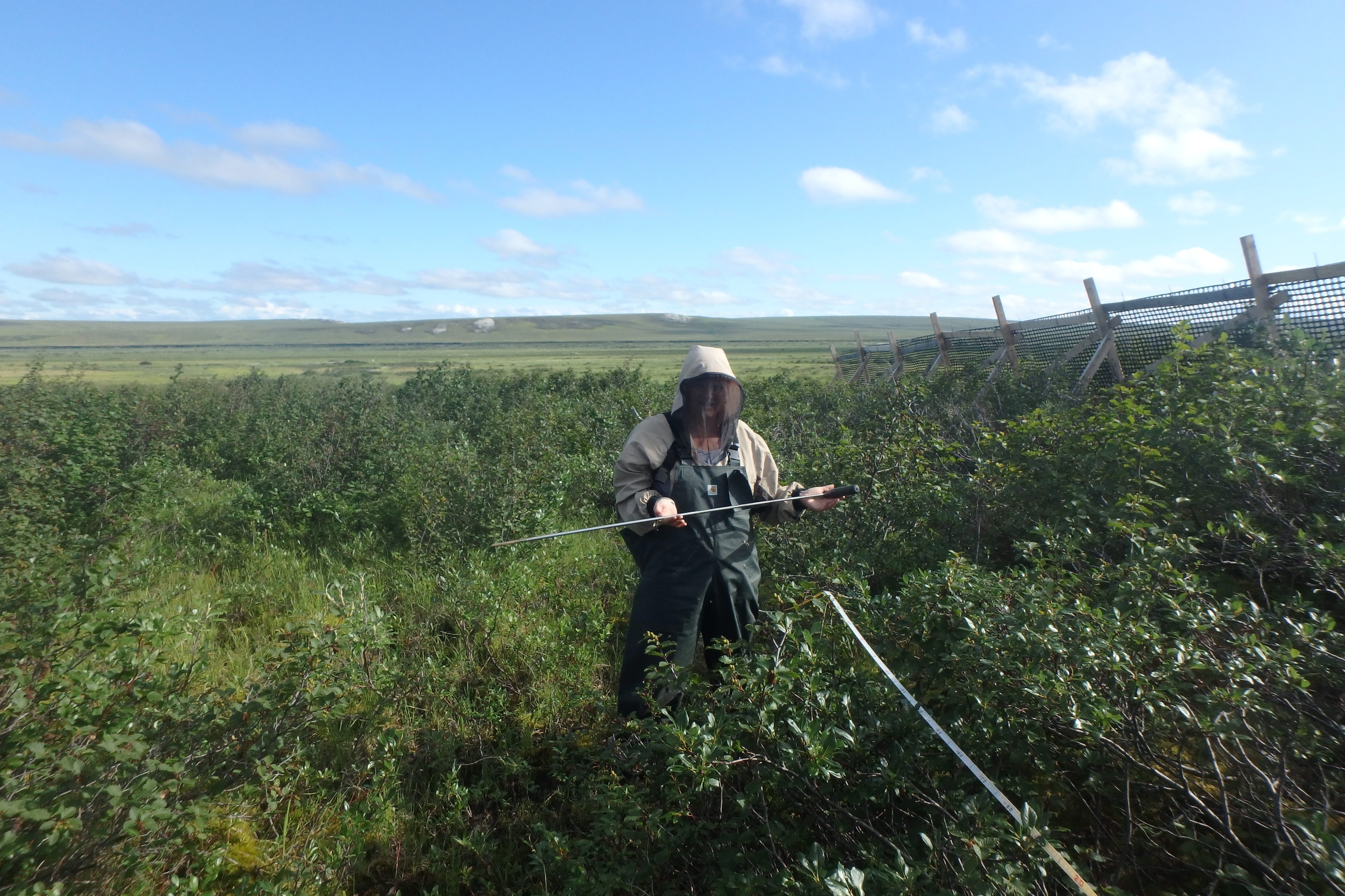 Svea Anderson holds the thaw melt probe at the Sagwon site. This site is where the lab studies the alder shrubs. Sagwon, Alaska.