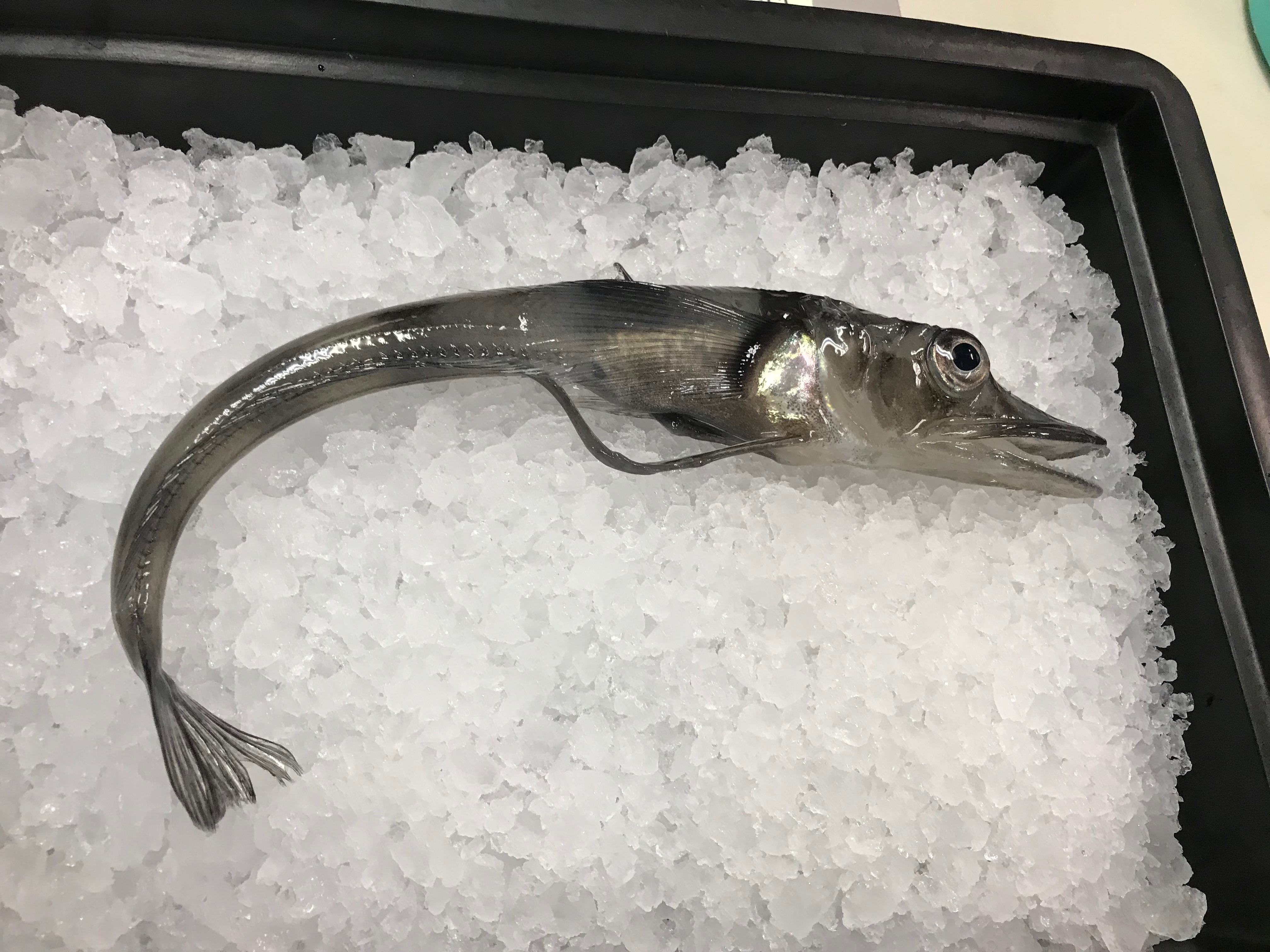 A dead icefish on ice, to be dissected and studied by the icefish team. Palmer Station, Antarctica.