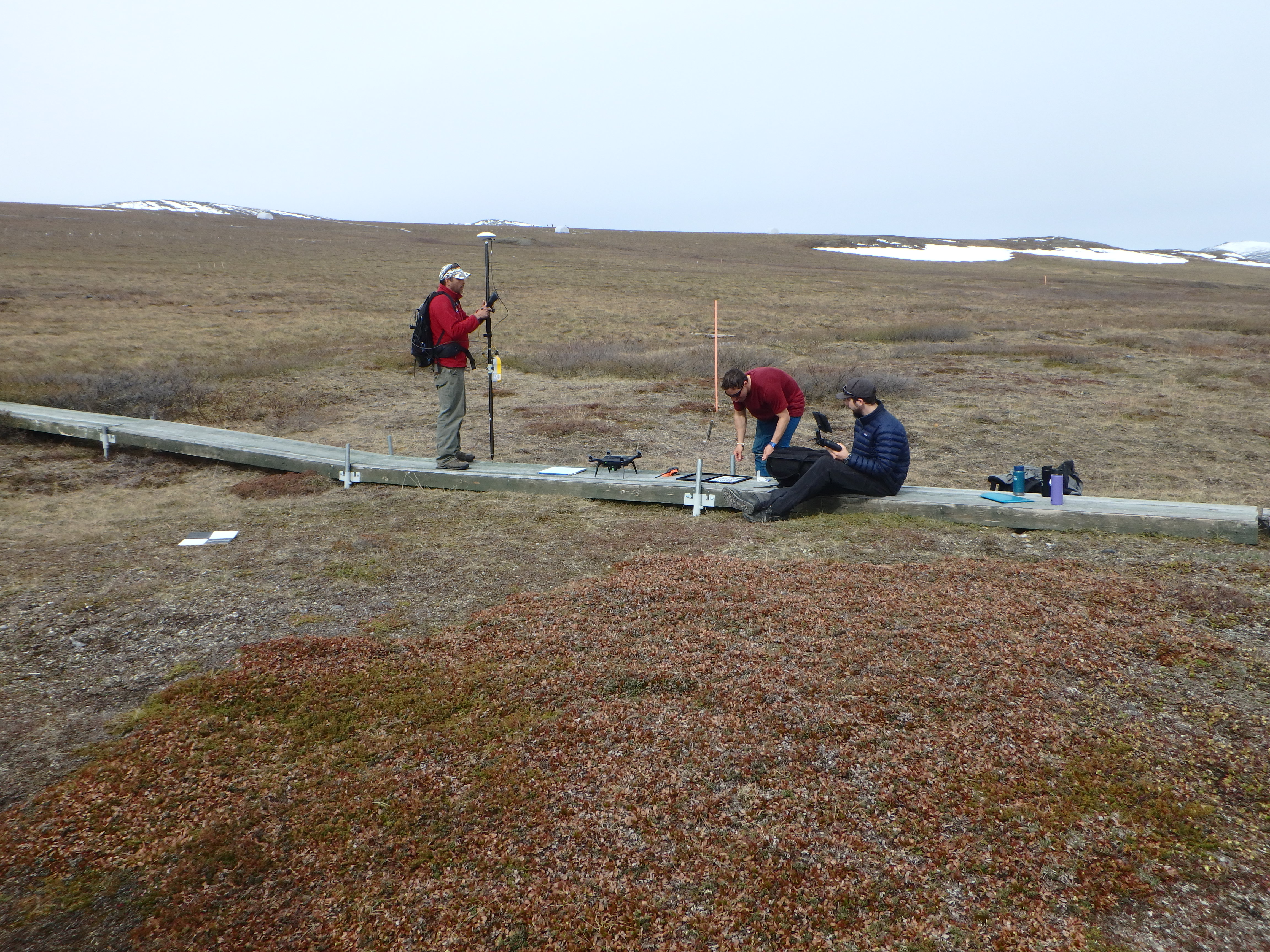 The Toolik GIS (Geographical Information Systems) and RS (remote sensing) team prepare the drone for take off. The drone collects NDVI images to correlate with the measurements taken by the MISP tram. Imnaviat Creek, Alaska.