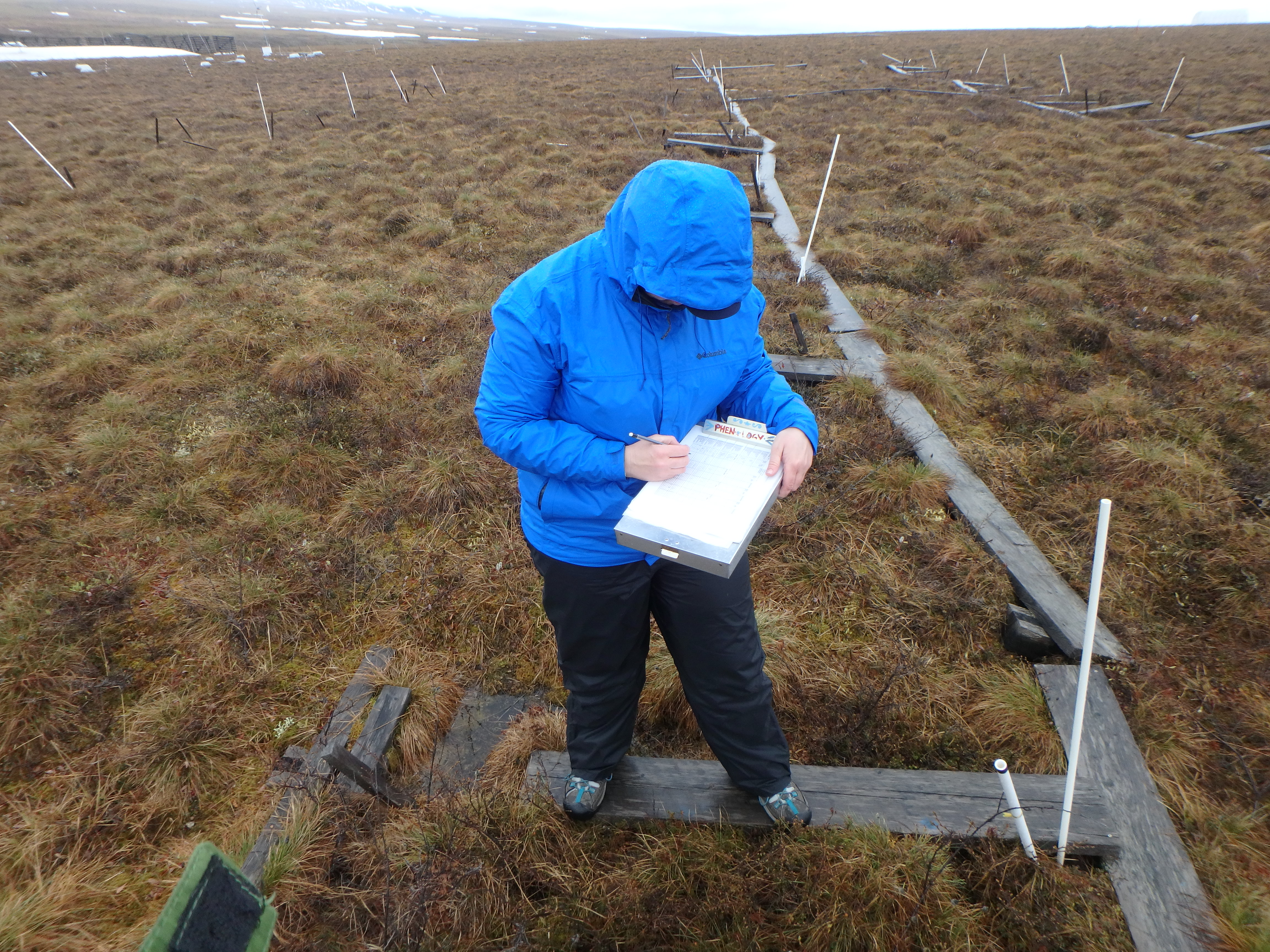 Melissa Lau assesses a phenology plot on a rainy morning. Toolik Field Station, Alaska.