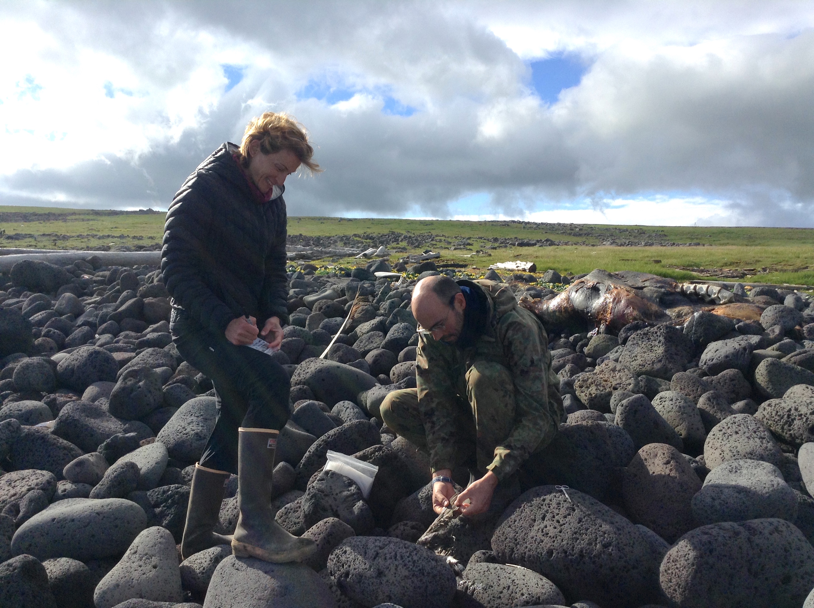 JB Thiebot and Wendi Pillars record data and collect samples from dead murres that have washed ashore. St. Lawrence Island, Alaska.
