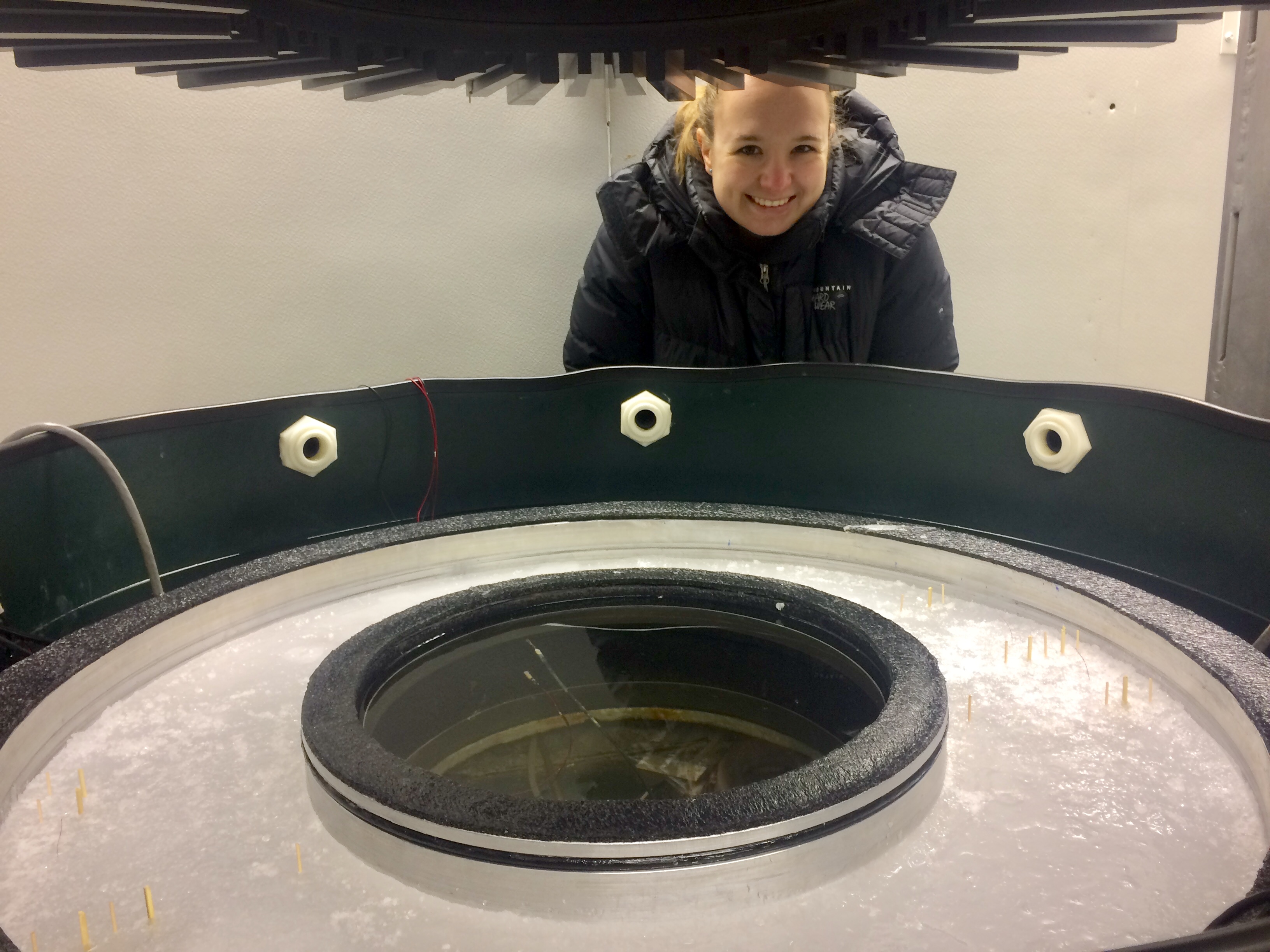 Graduate student Anna Thompson poses in front of the ice ring apparatus that she uses to replicate glacier sliding. Iowa State University, Ames, Iowa.